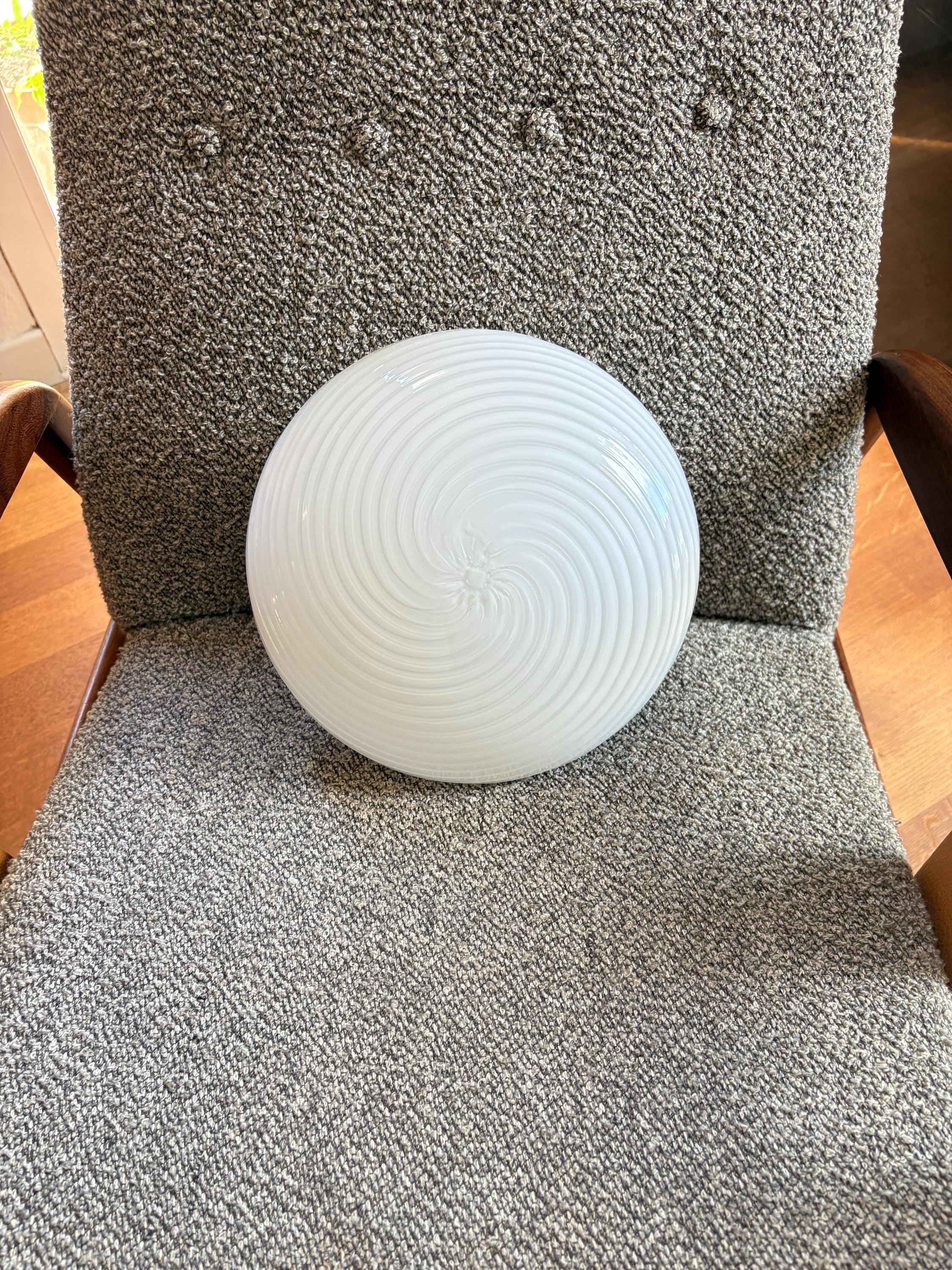 ✨ Un capolavoro di Murano: questa lampada vintage è una vera opera d'arte, con uno splendido vetro rigadin a spirale bianco che cattura lo sguardo e illumina con raffinatezza.