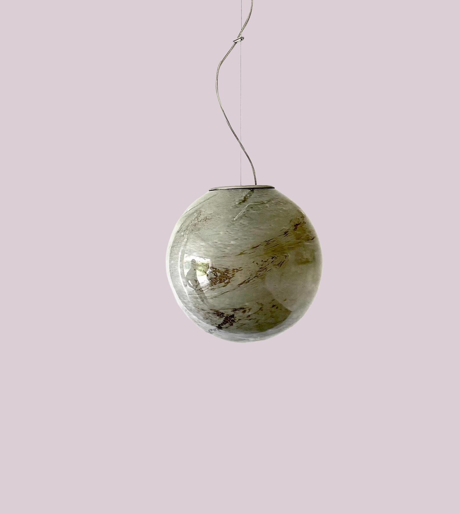 La lampada è realizzata a forma di sfera, diametro 30 cm, la montatura è in metallo con finitura silver, predisposta per 1 lampadina E27, compatibile con lampadine E26 negli Stati Uniti.