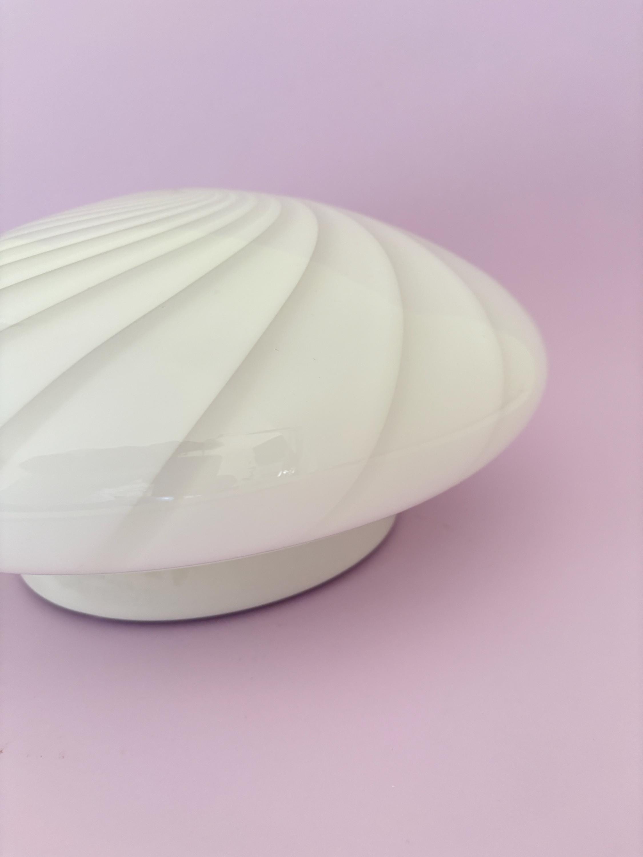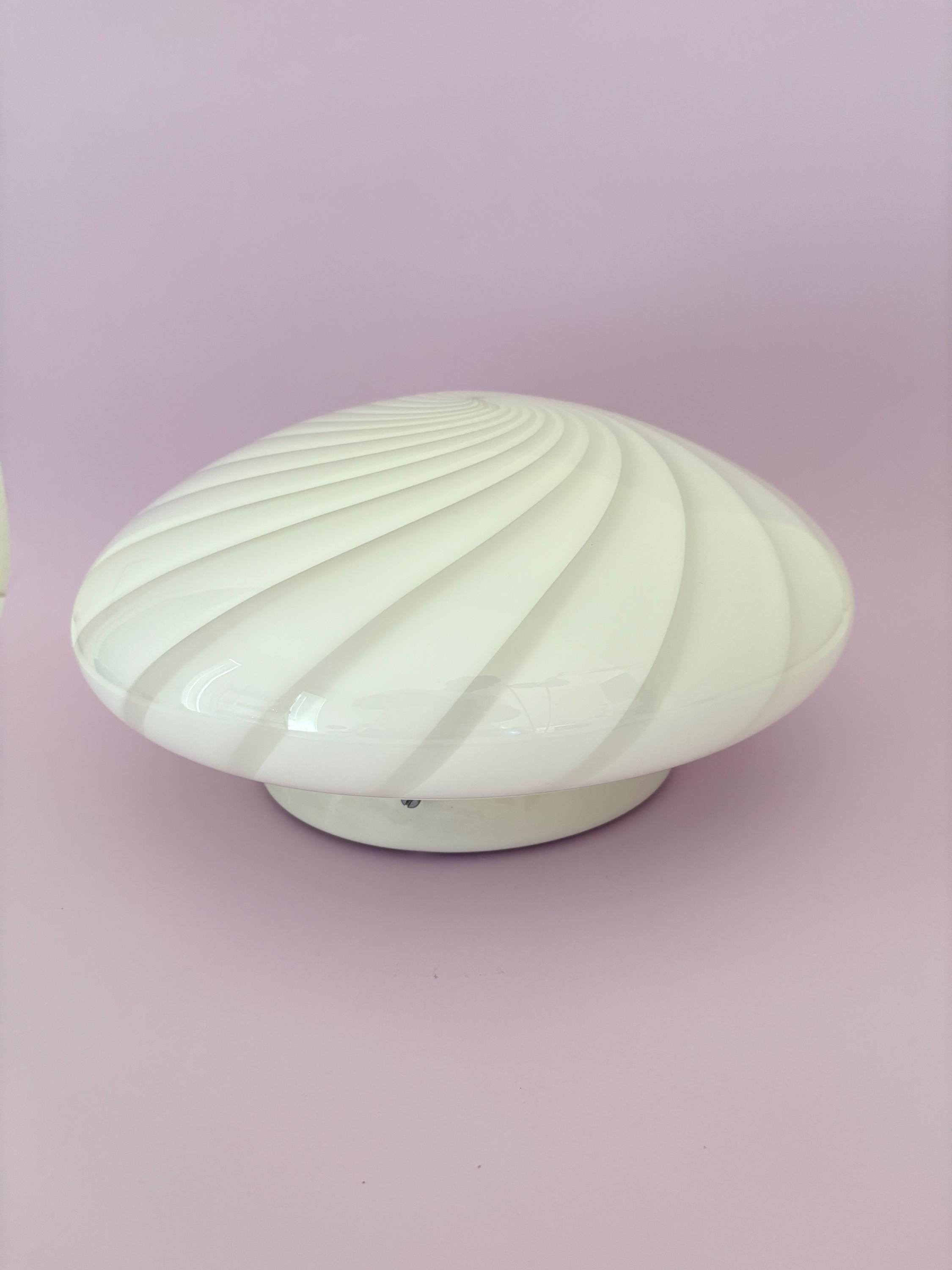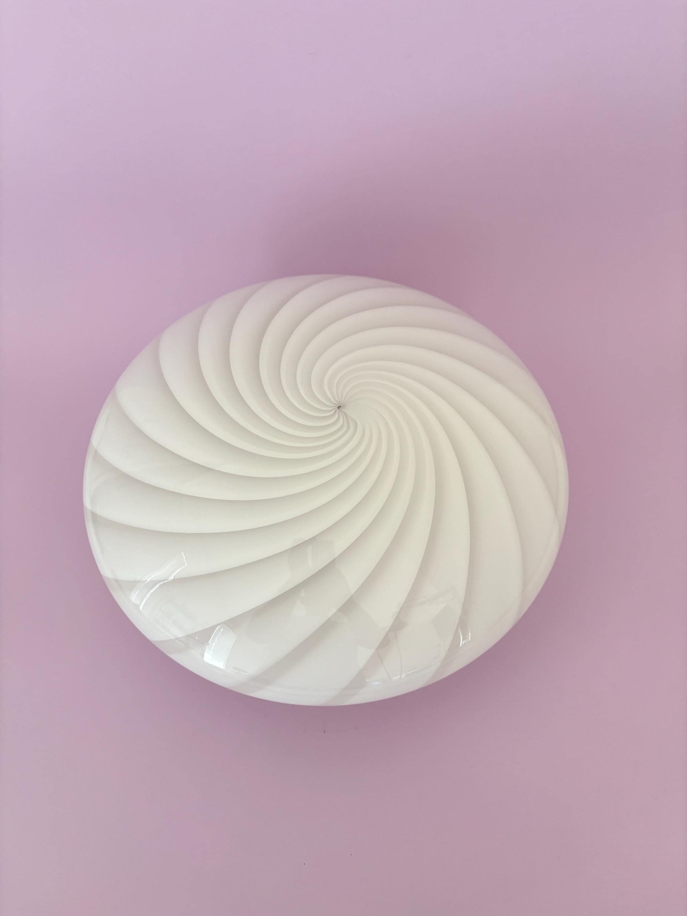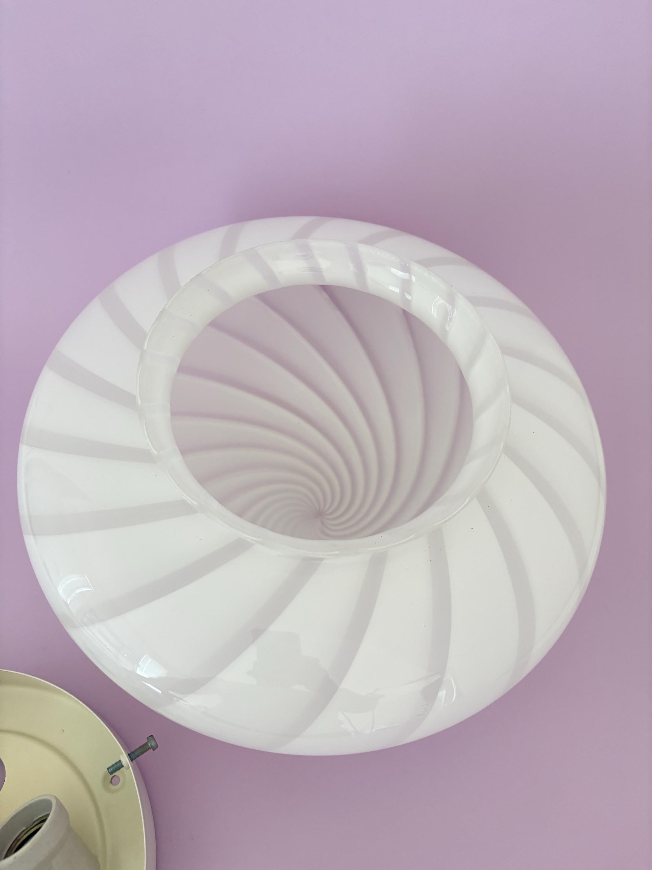 ✨ Un capolavoro di Murano: questa lampada vintage è una vera opera d'arte, con uno splendido vetro rigadin a spirale bianco che cattura lo sguardo e illumina con raffinatezza.