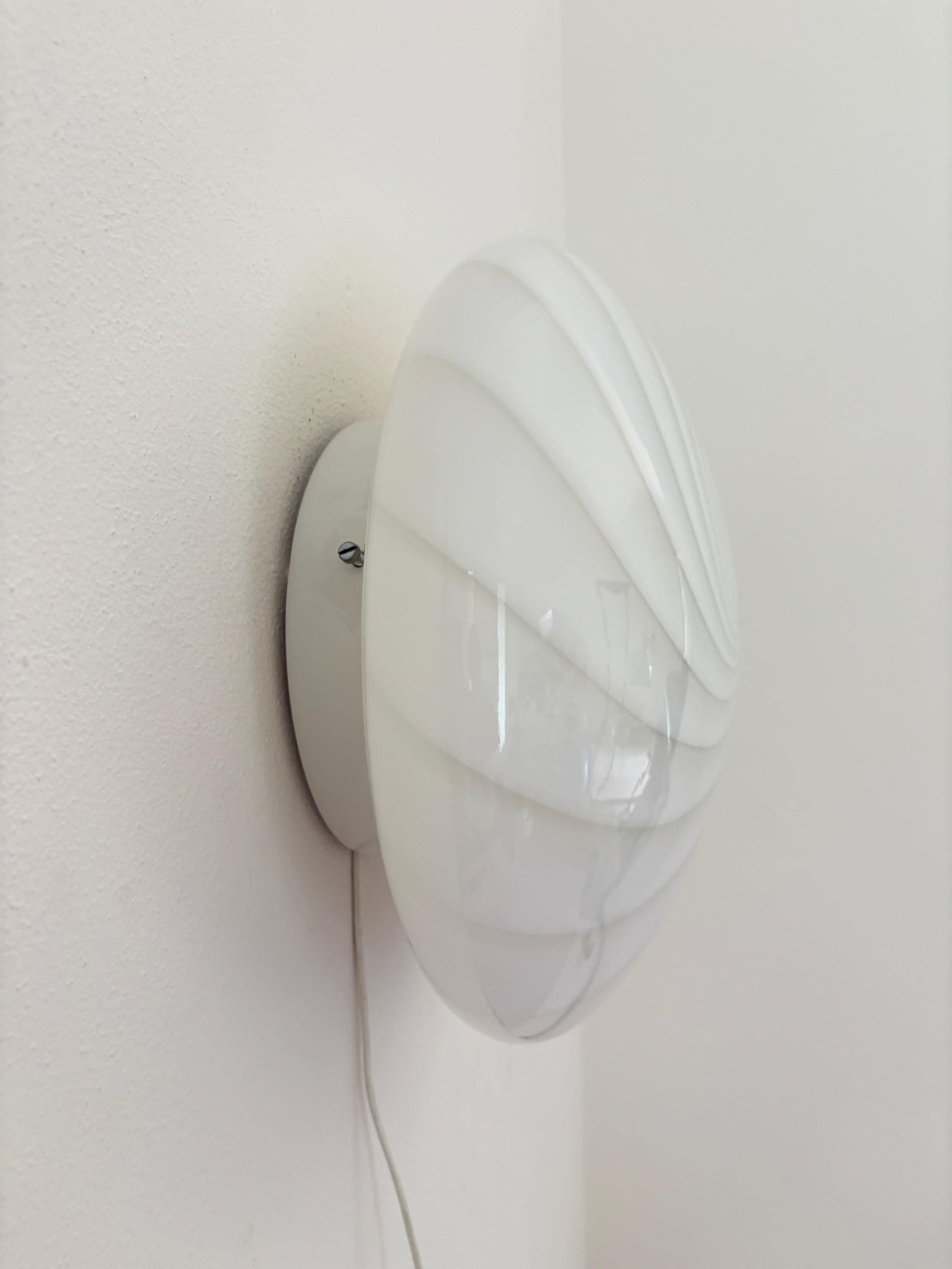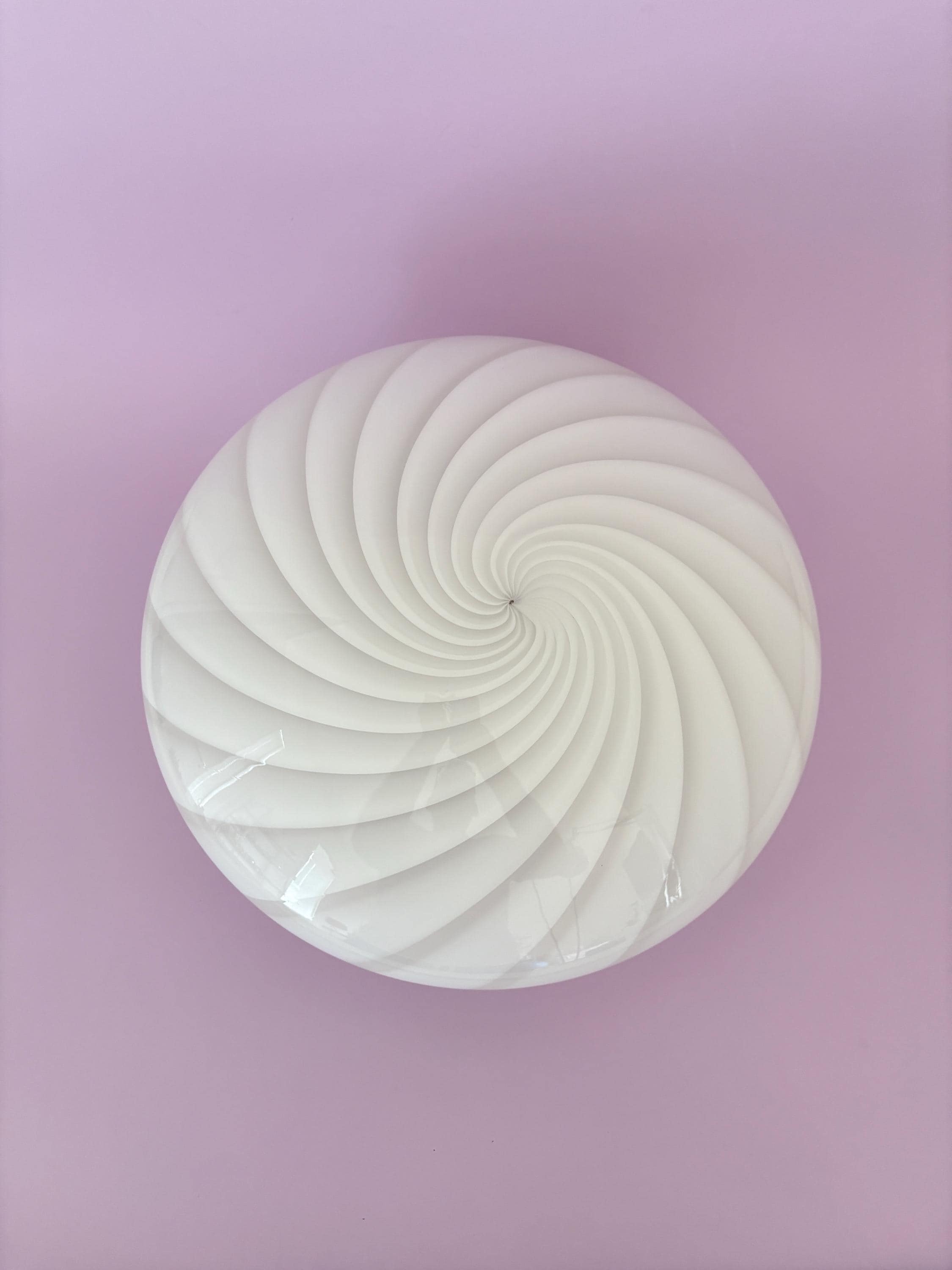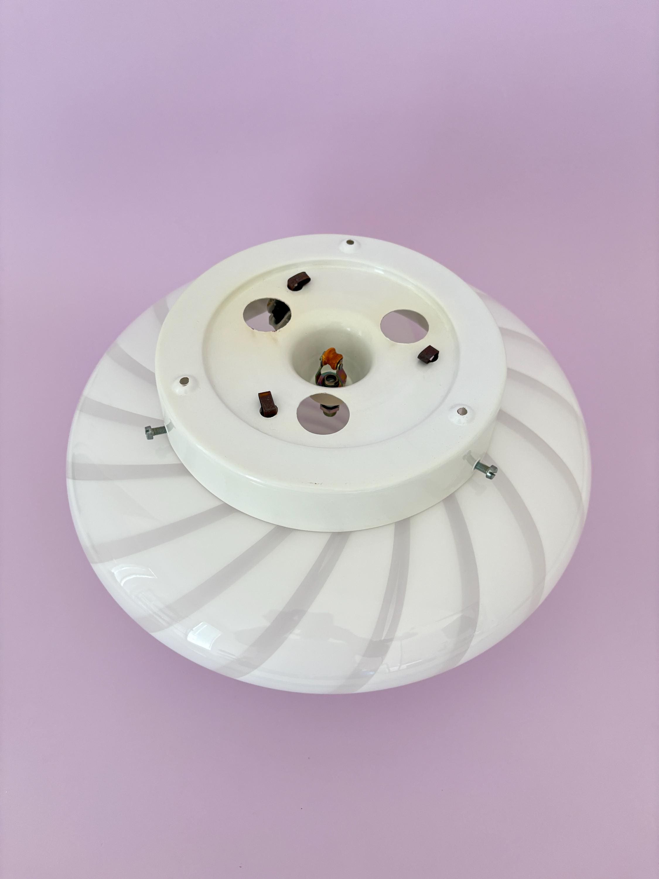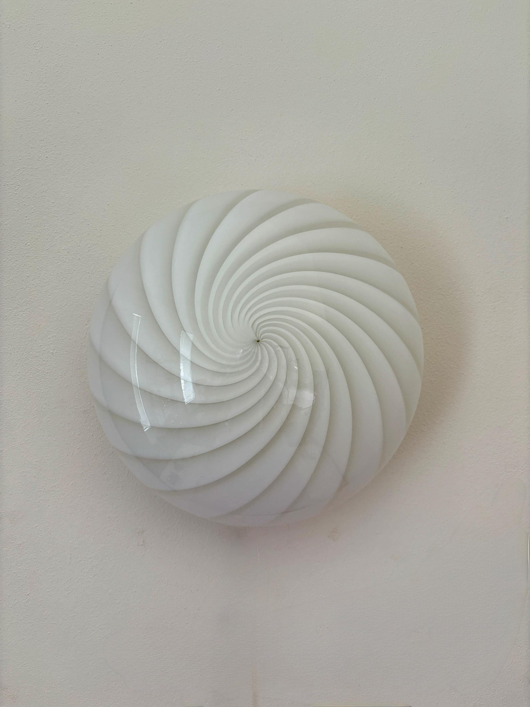 ✨ Un capolavoro di Murano: questa lampada vintage è una vera opera d'arte, con uno splendido vetro rigadin a spirale bianco che cattura lo sguardo e illumina con raffinatezza.