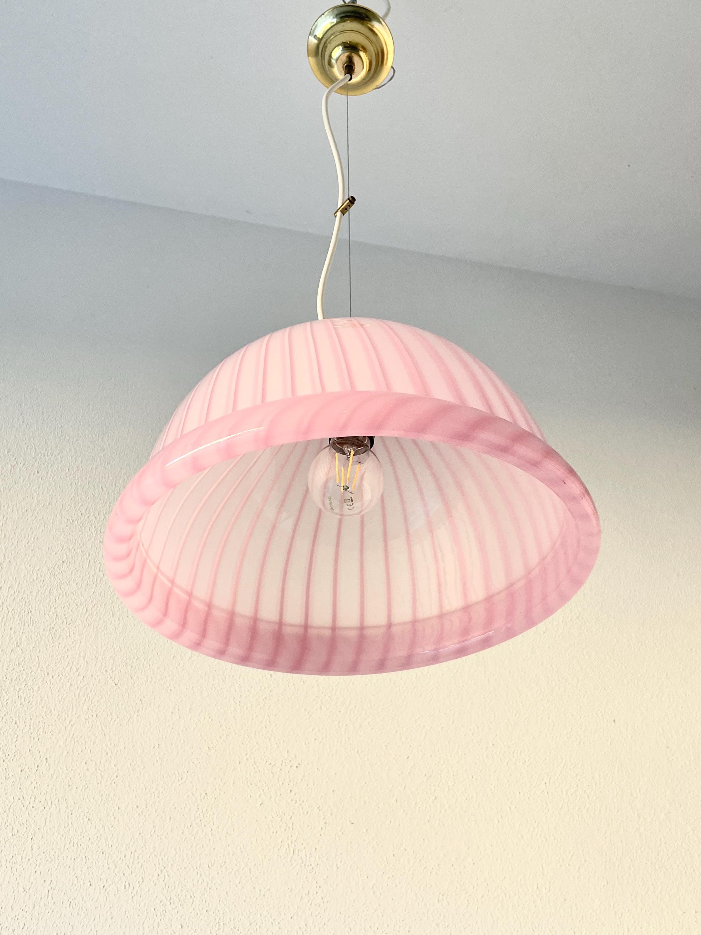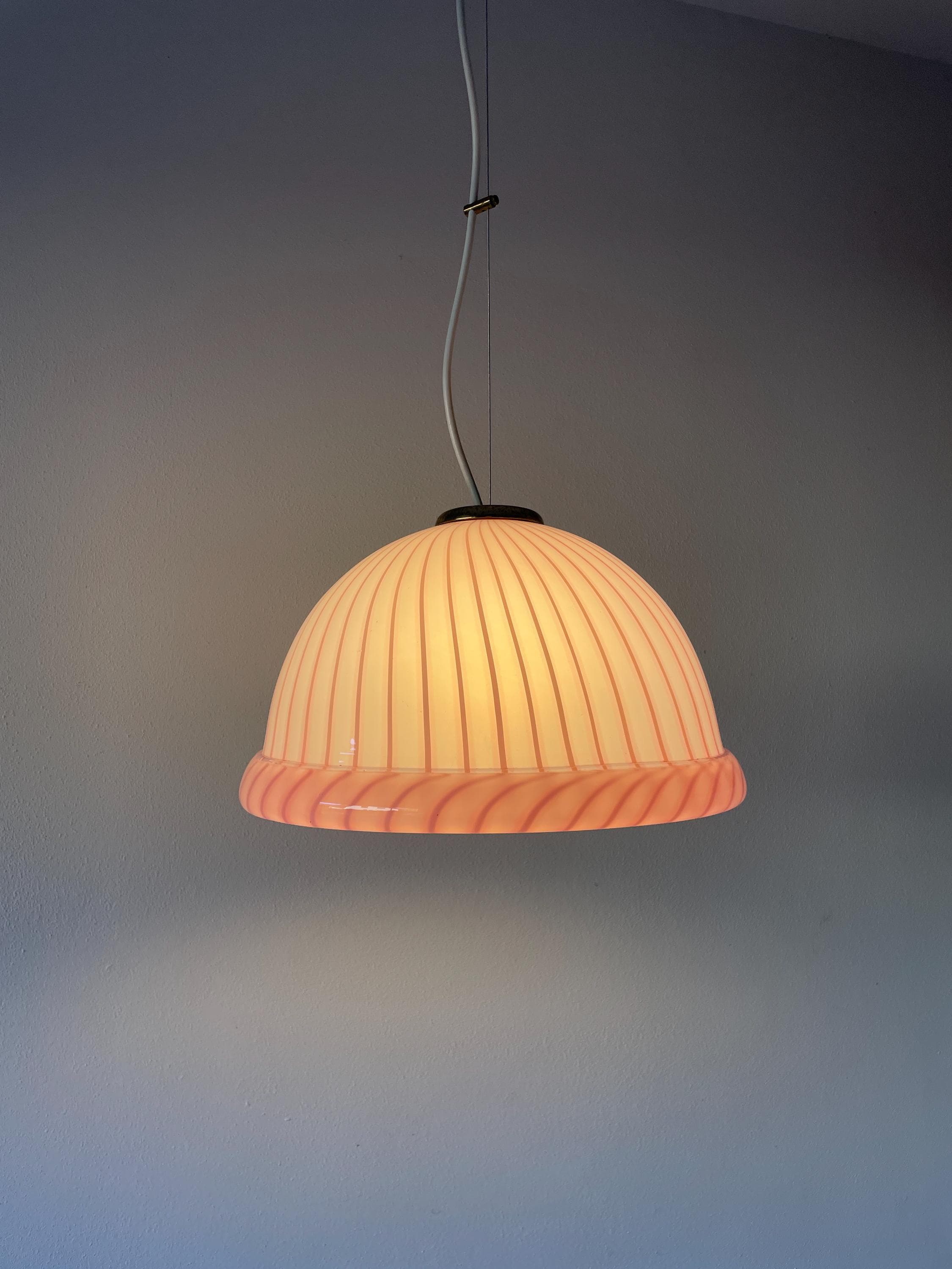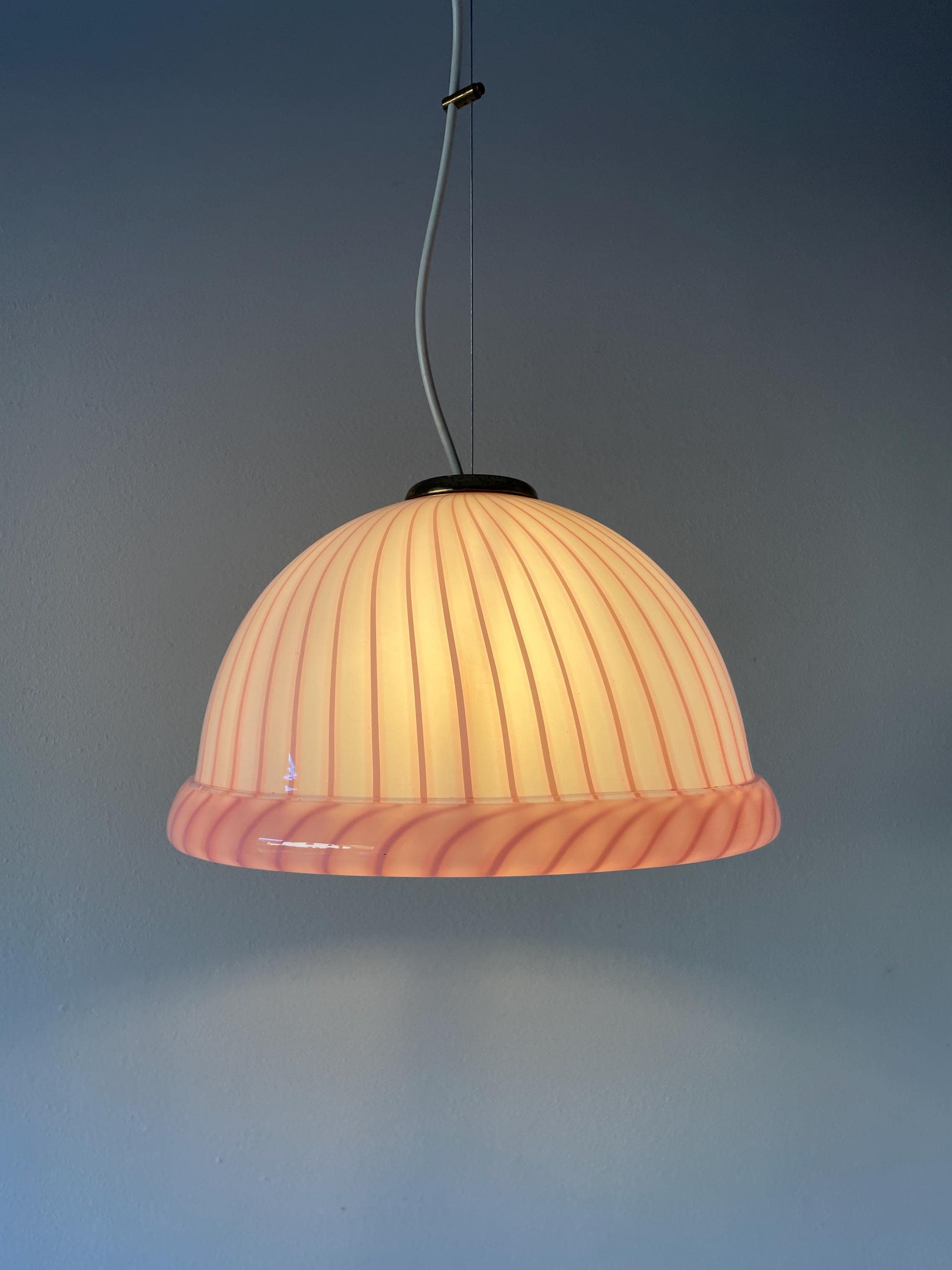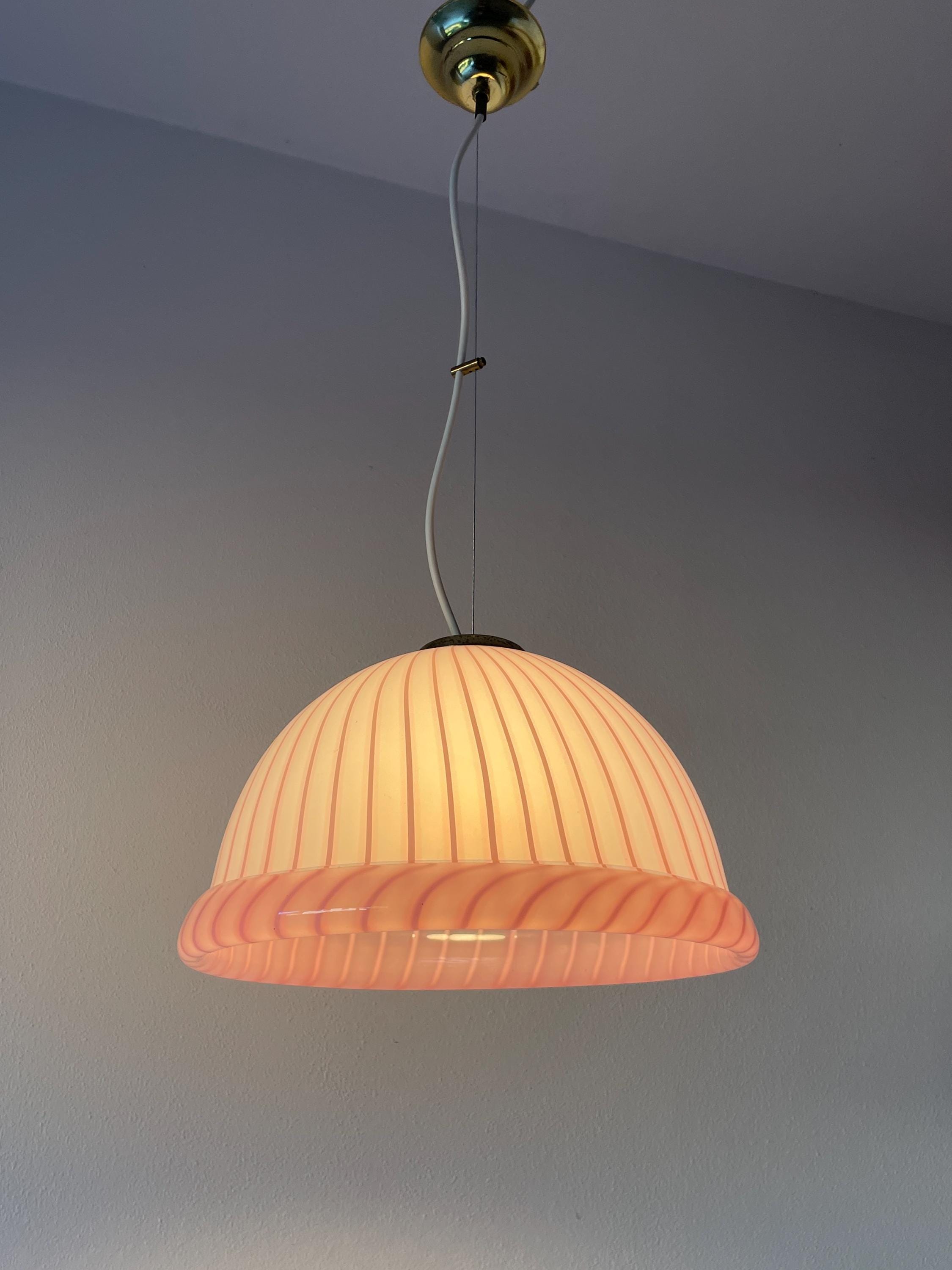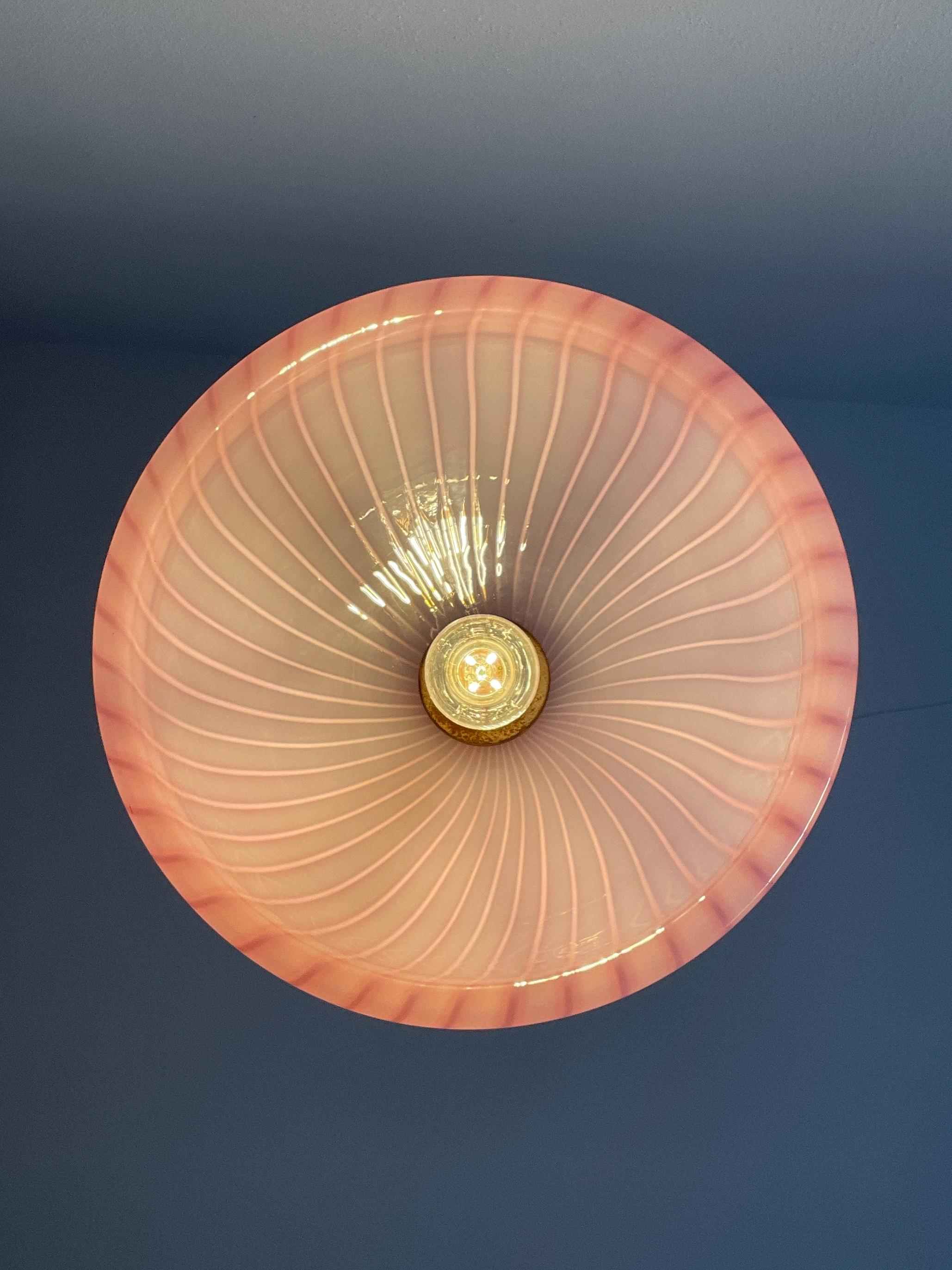 Splendida LAMPADA DA SOFFITTO FILIGRANA DI MURANO, vintage degli anni '80, in vetro soffiato a bocca con motivo a righe di filigrana rosa, montatura in ottone.
