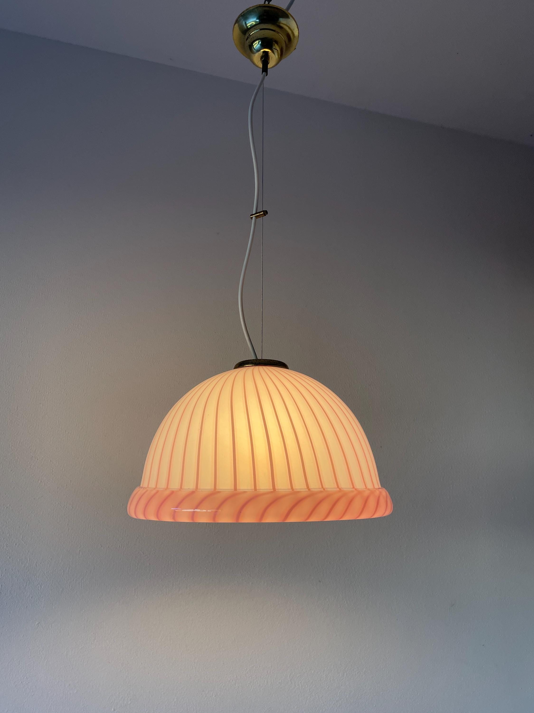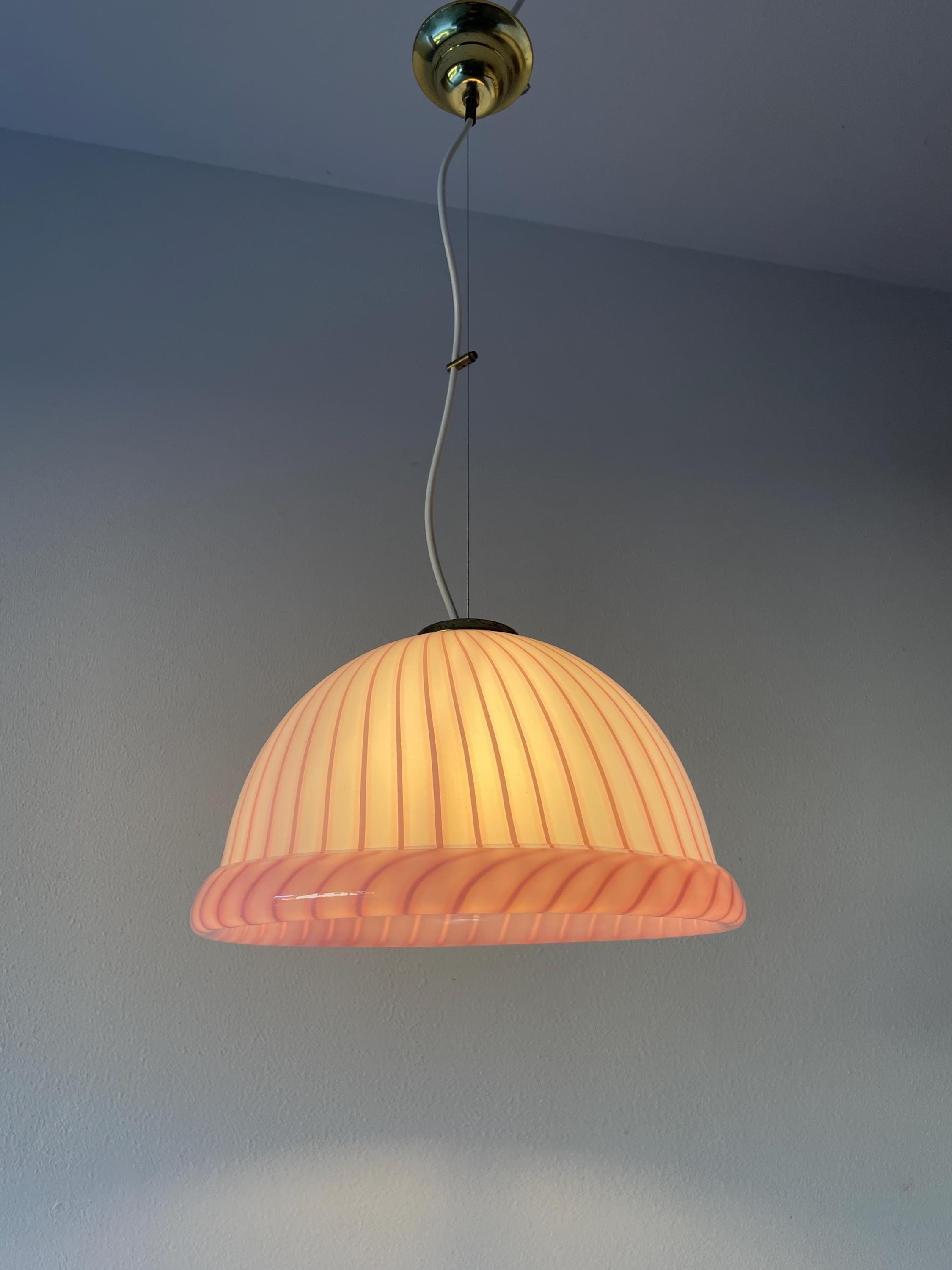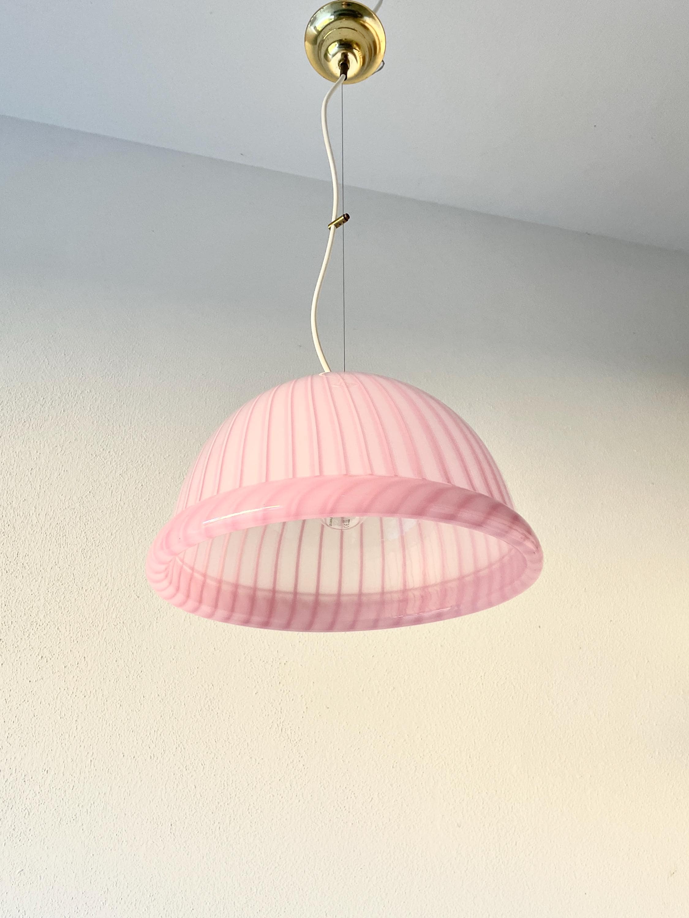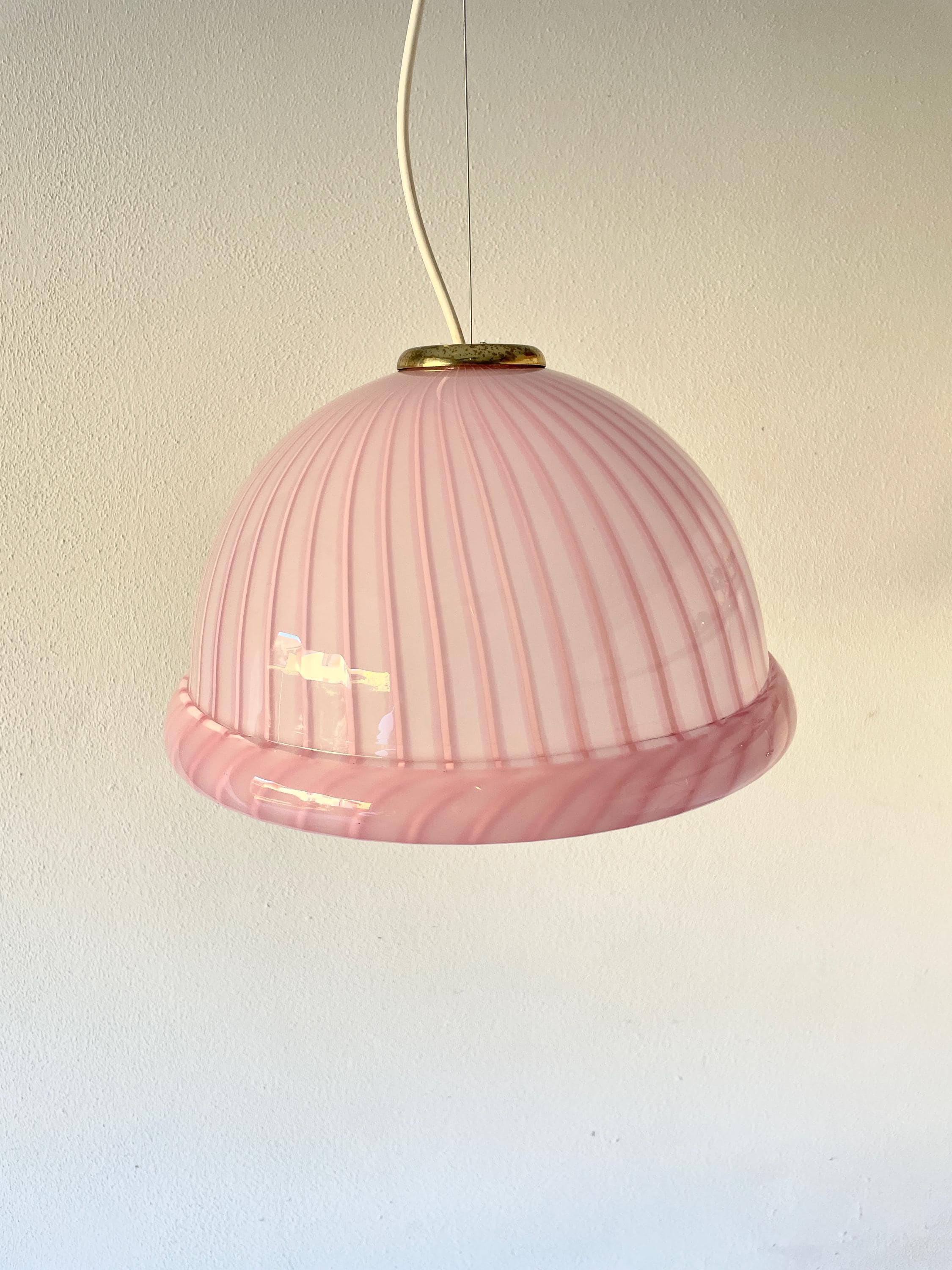 Splendida LAMPADA DA SOFFITTO FILIGRANA DI MURANO, vintage degli anni '80, in vetro soffiato a bocca con motivo a righe di filigrana rosa, montatura in ottone.