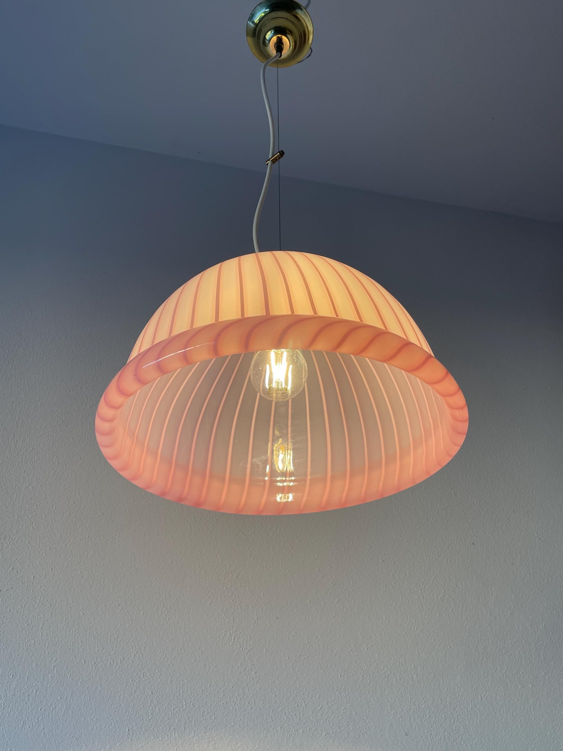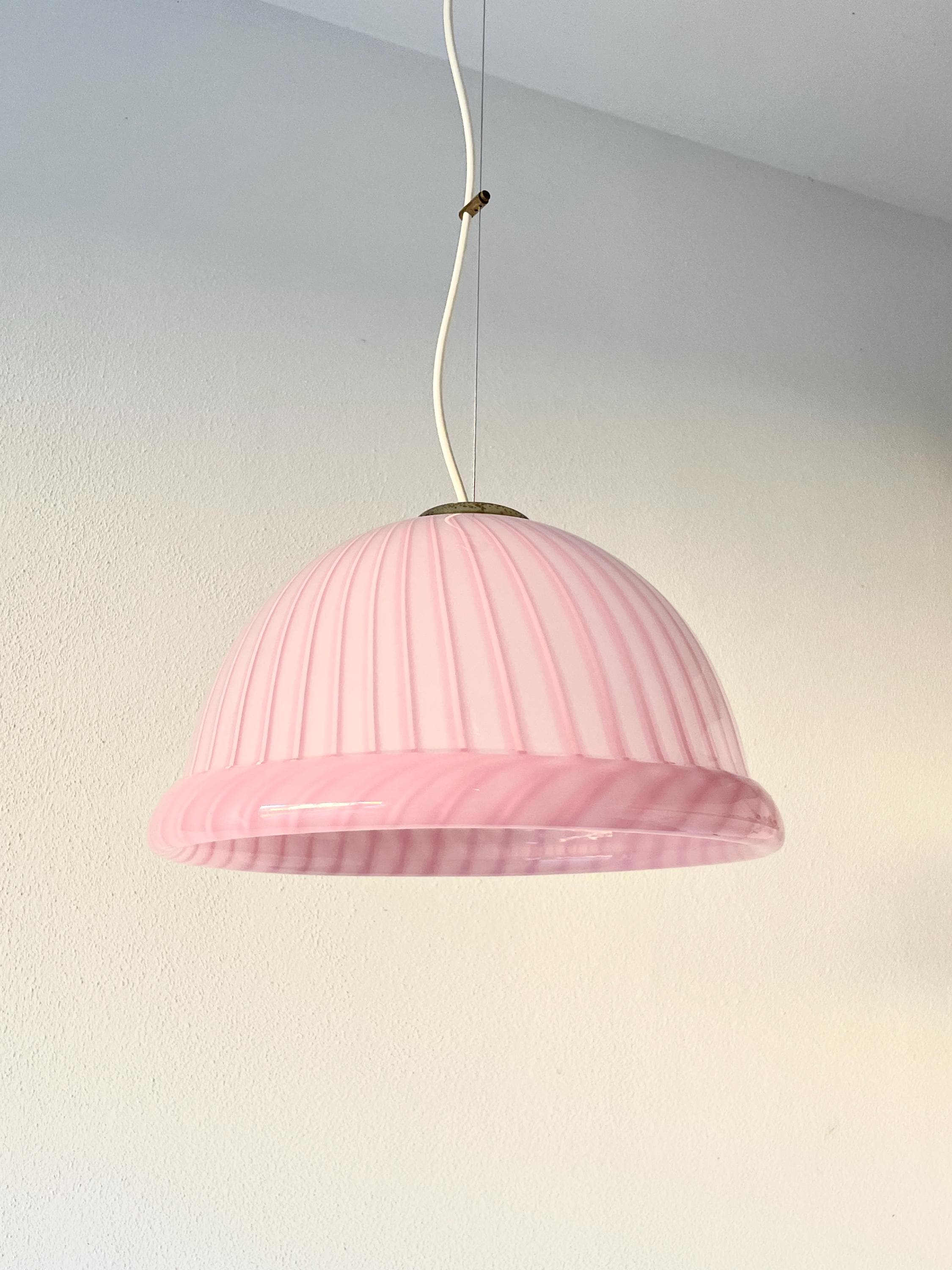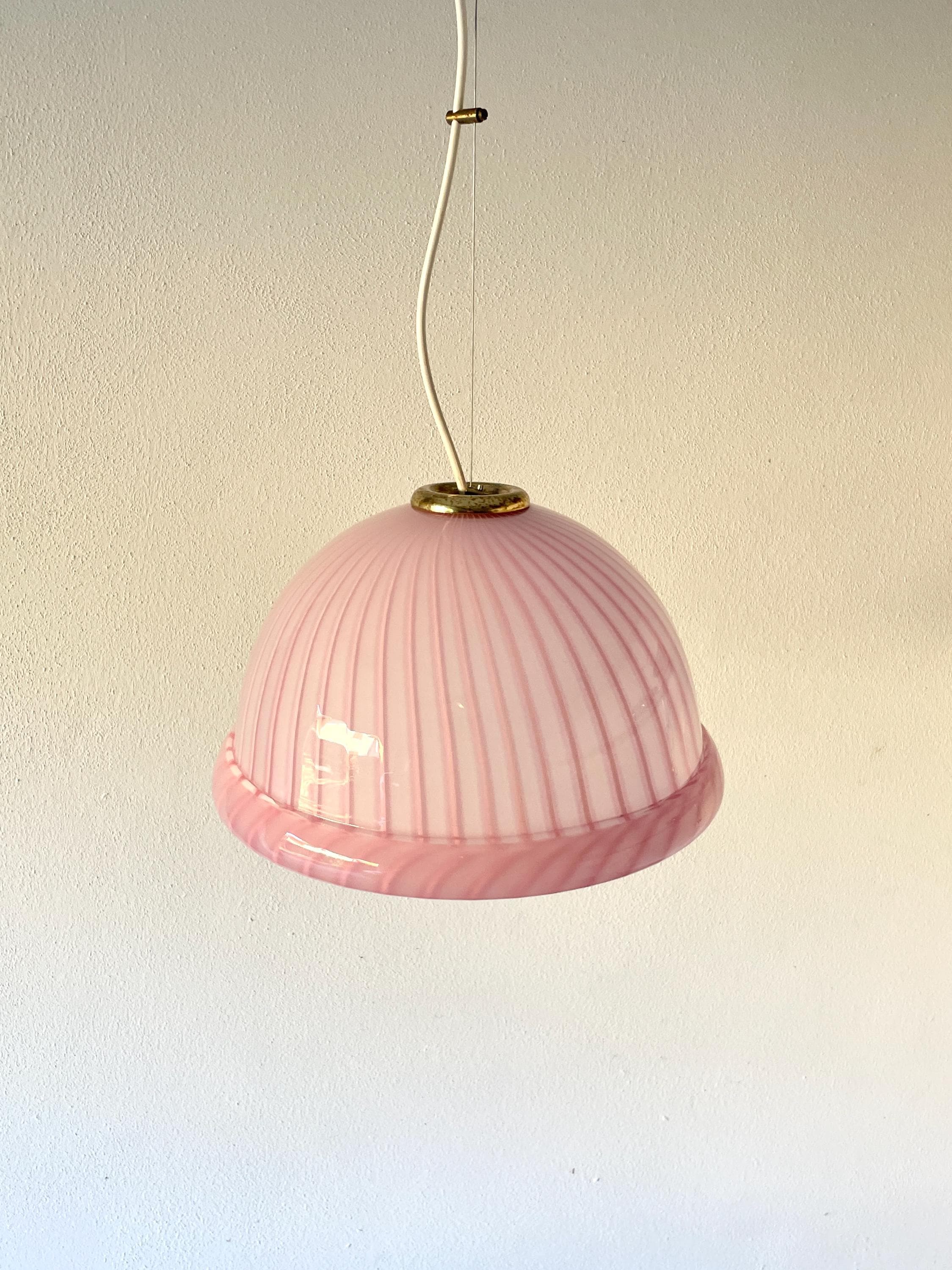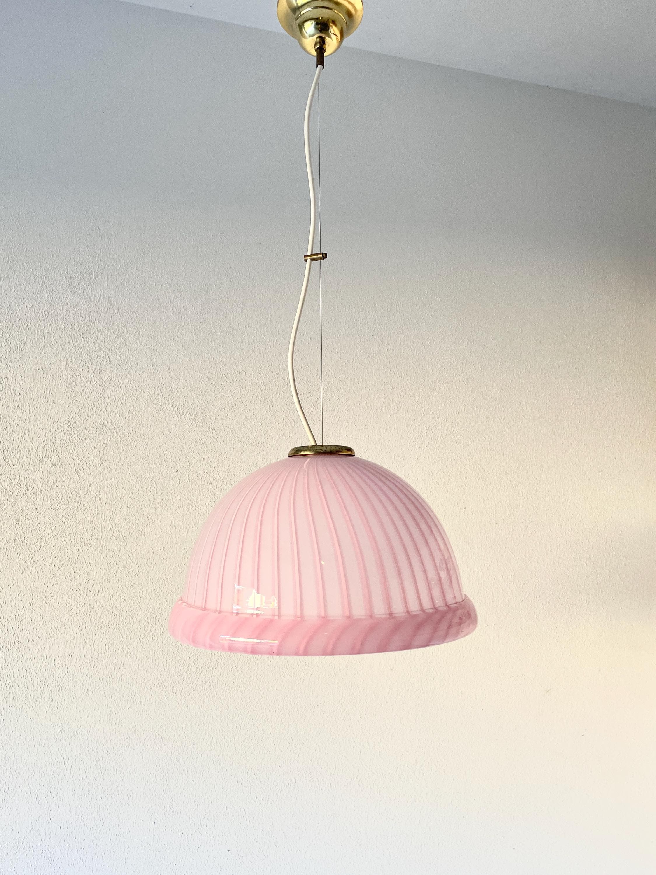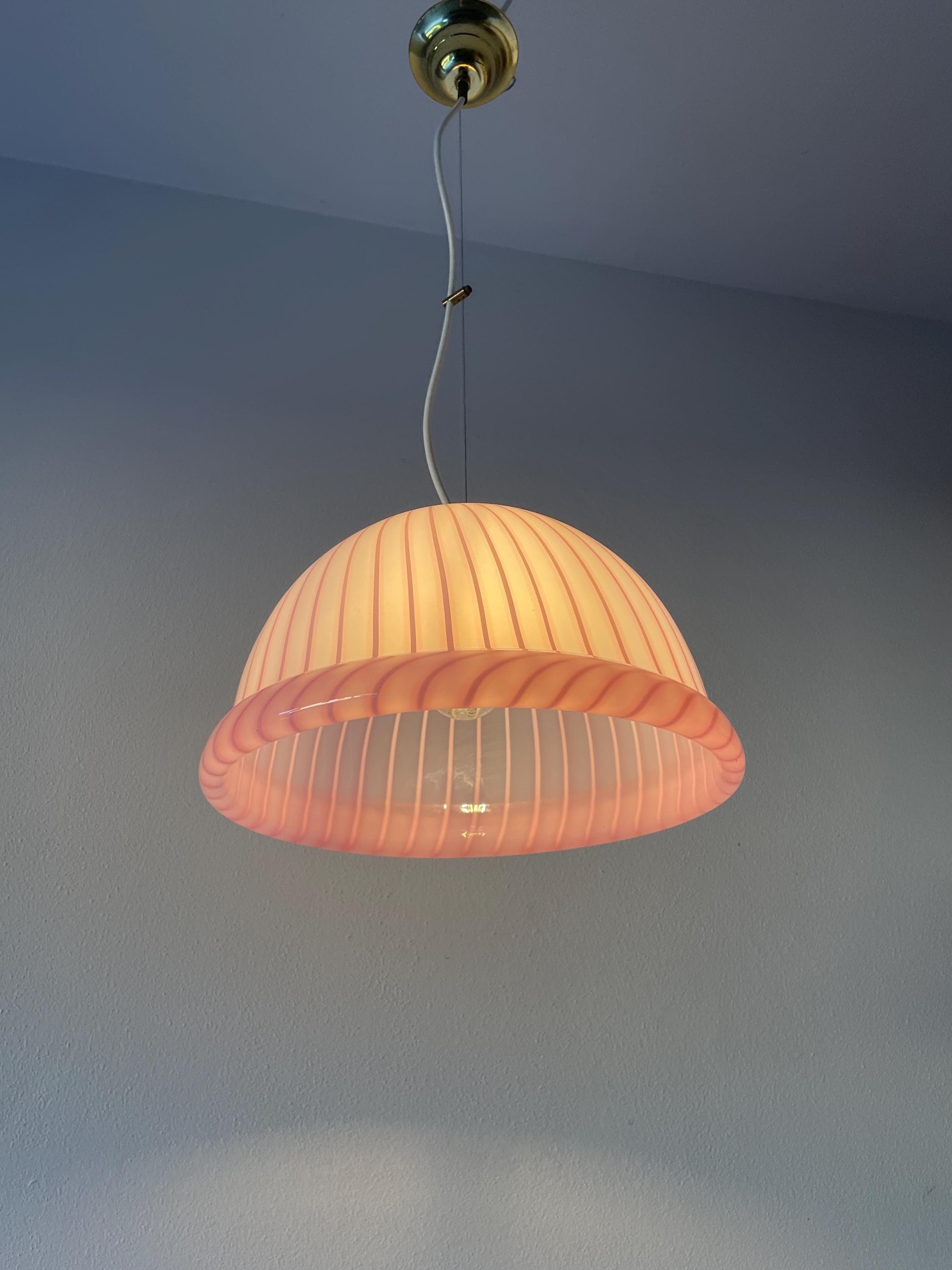 Splendida LAMPADA DA SOFFITTO FILIGRANA DI MURANO, vintage degli anni '80, in vetro soffiato a bocca con motivo a righe di filigrana rosa, montatura in ottone.
