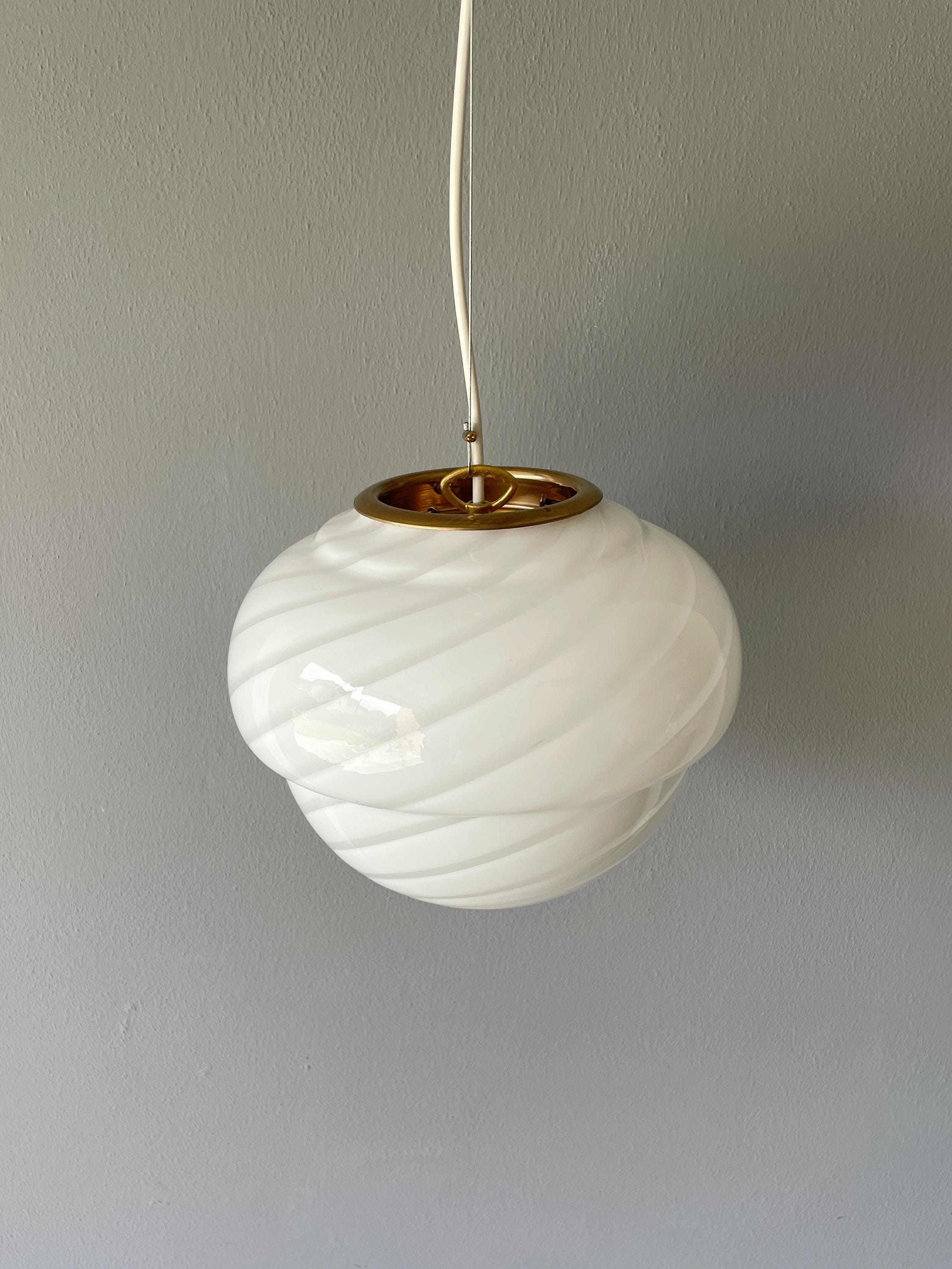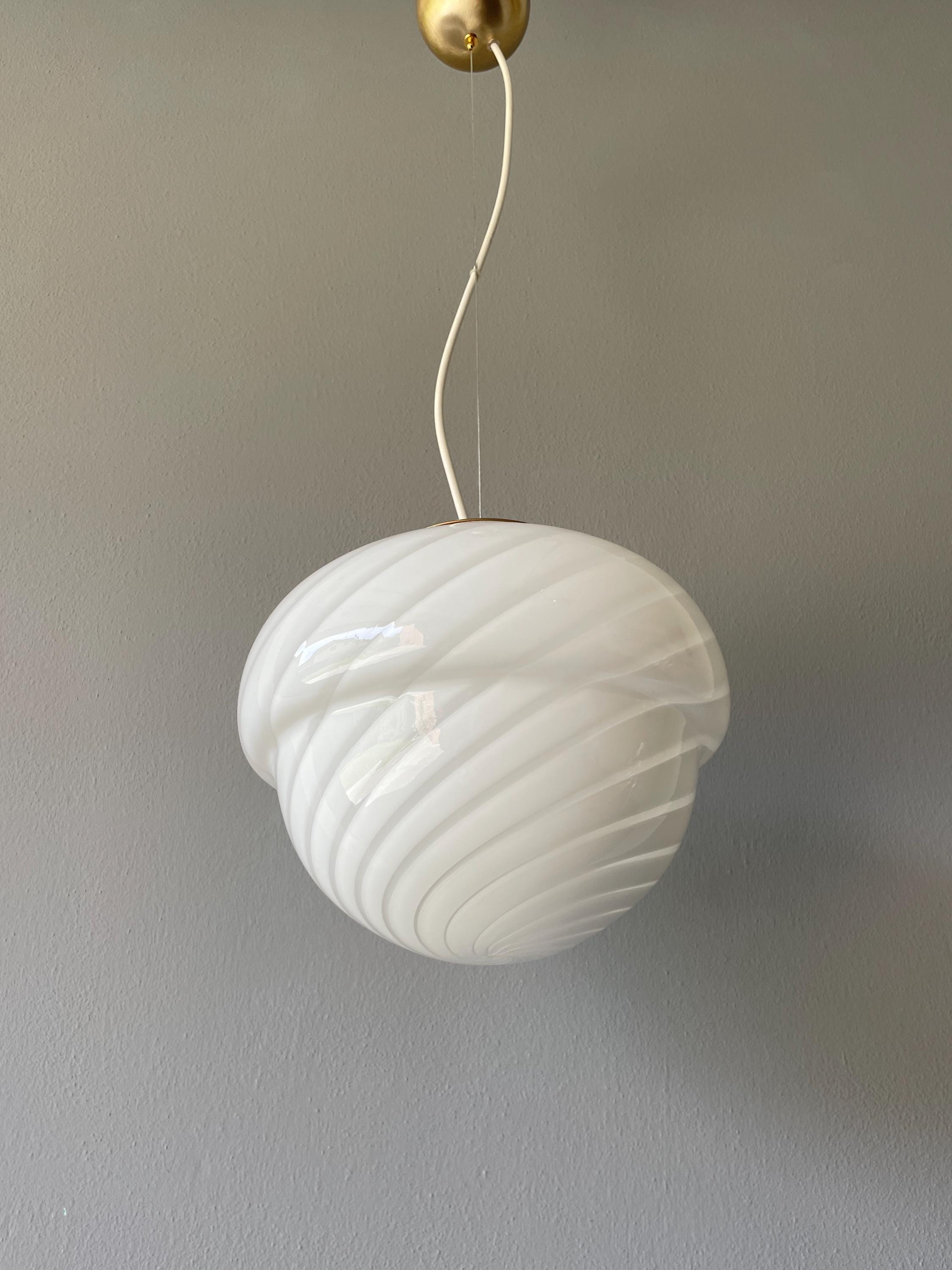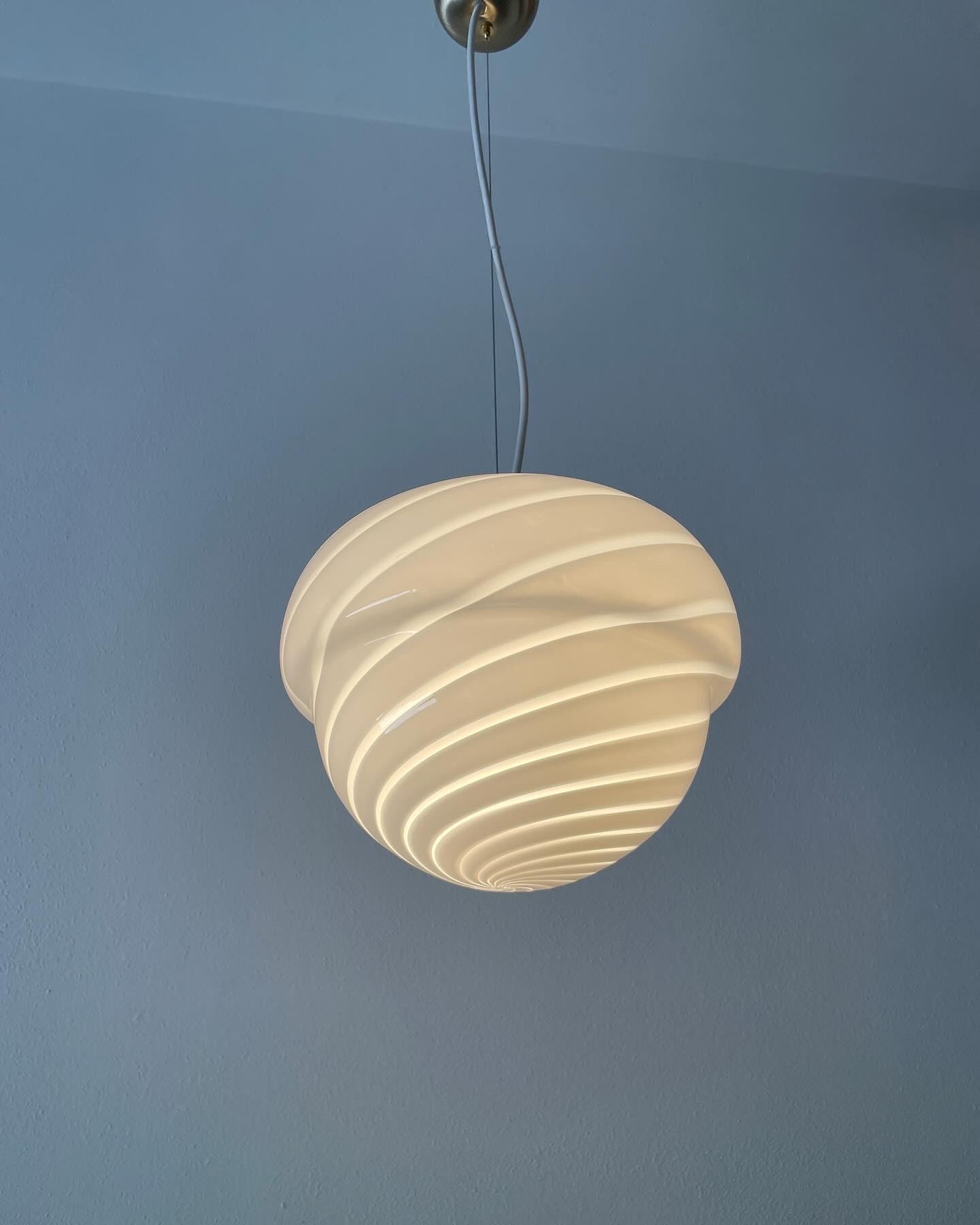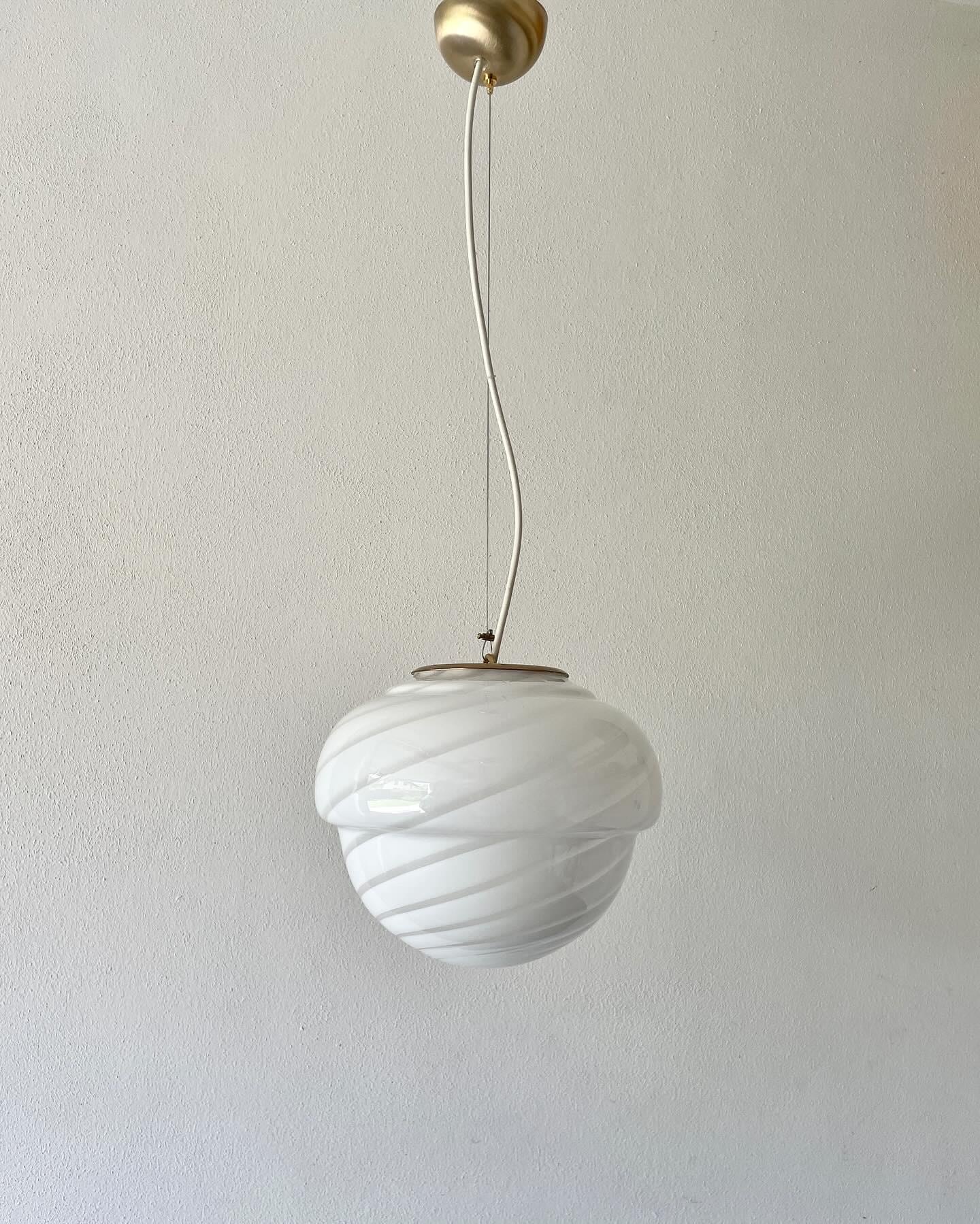Raro e grazioso lampadario in vetro di Murano con vetro rigadin a spirale bianco, originale vintage degli anni '70, con vetro di Murano soffiato e lavorato a mano.