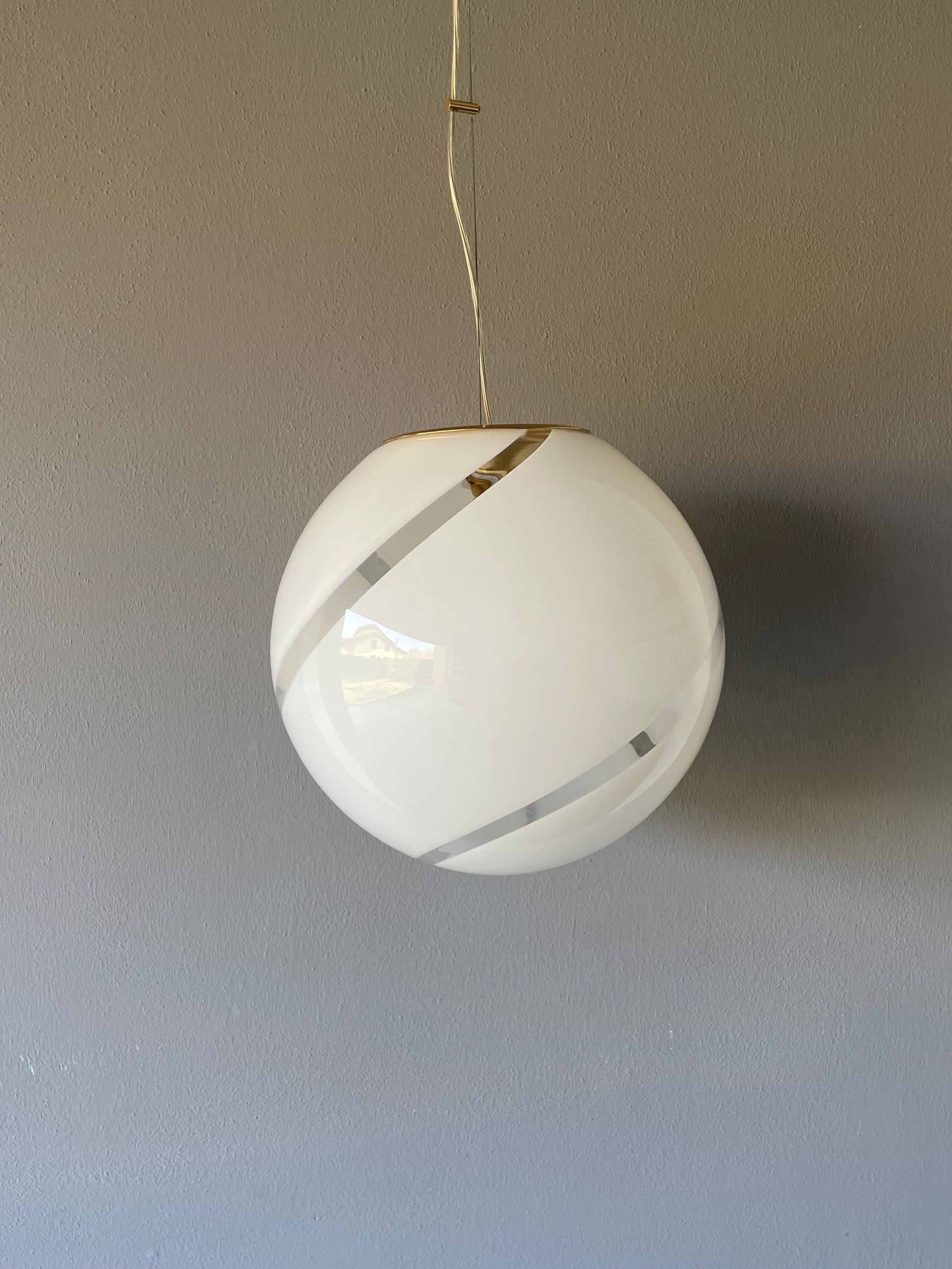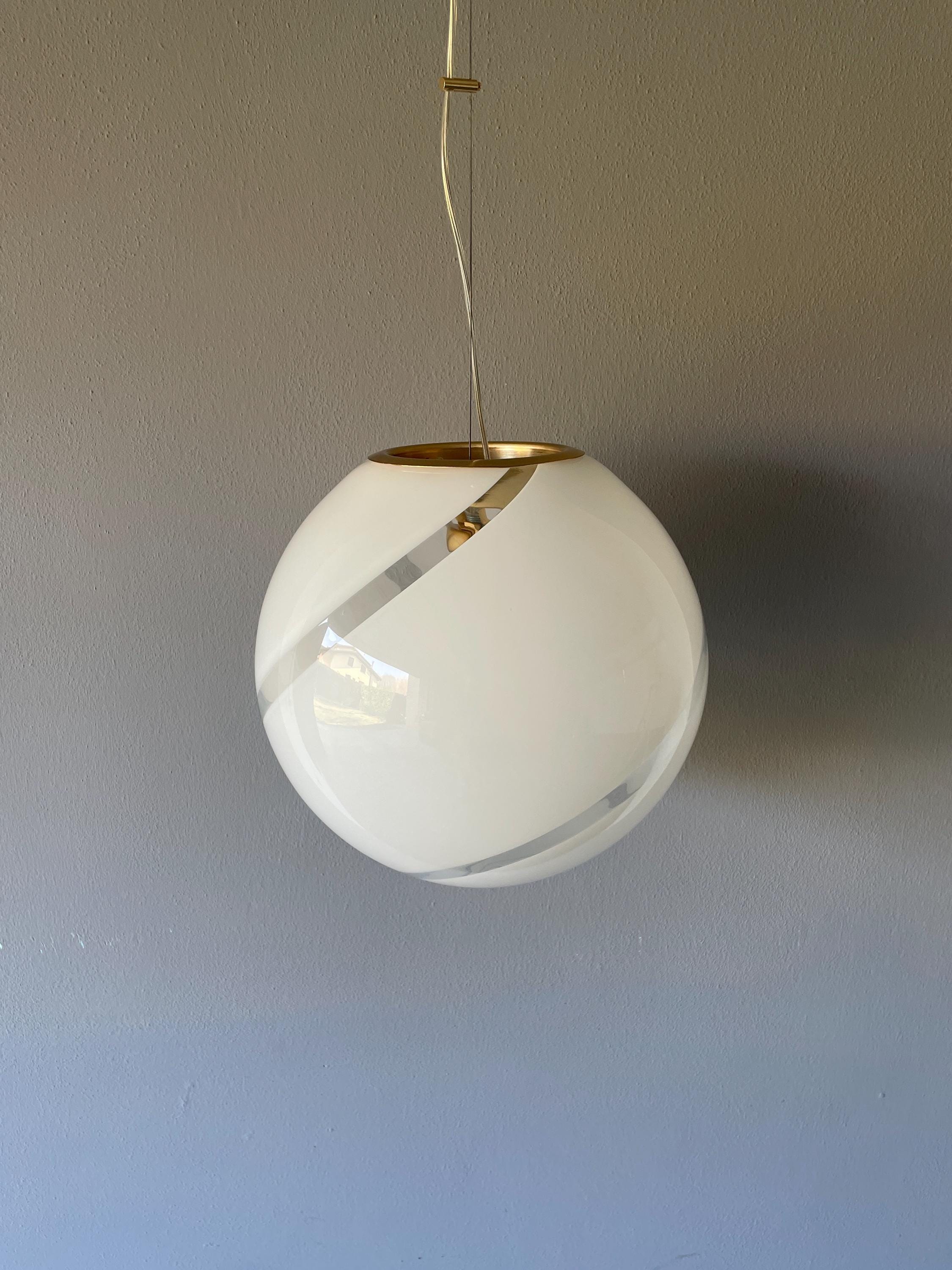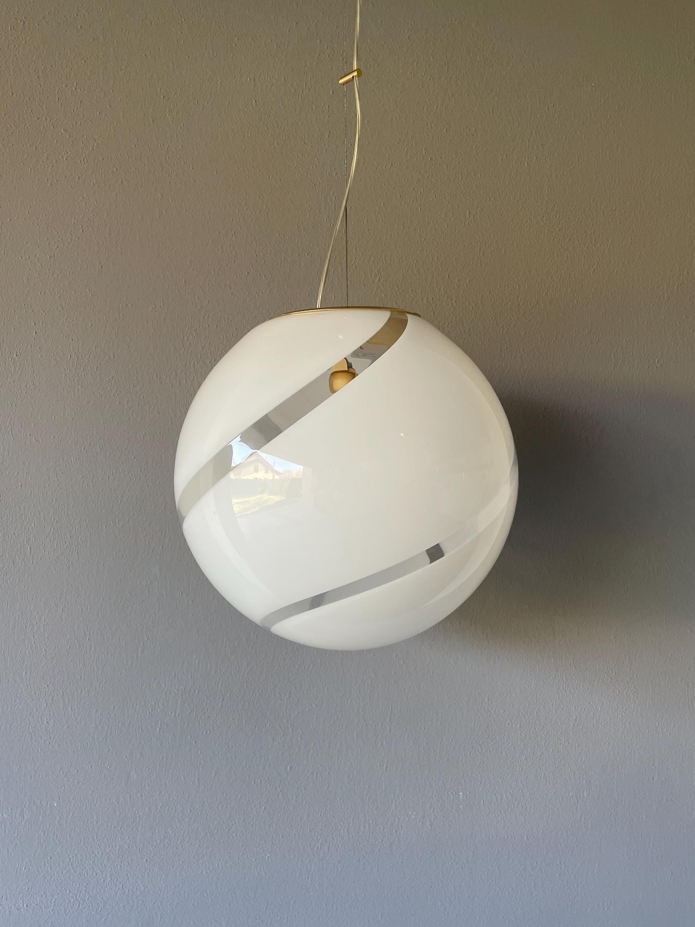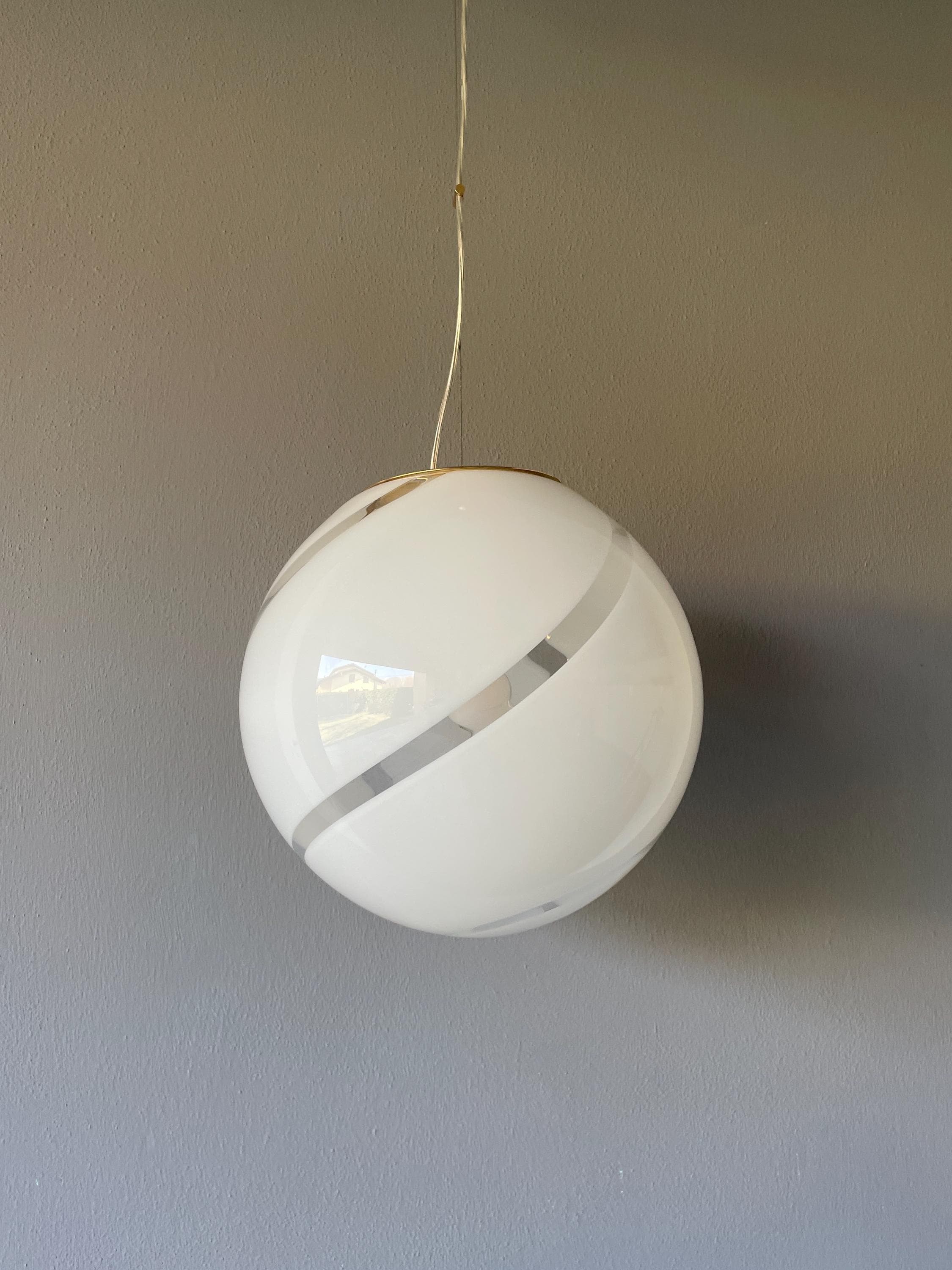Splendidido lampadario in vetro di Murano, soffiato a bocca, nell'antica tecnica Muranese delle canne ritorte a spirale, bellissimo il vetro incamiciato, bianco e trasparente, la montatura ha finitura oro satinato, solo su richiesta, dopo aver fatto l'ordine, si può avere con montatura silver satinato.