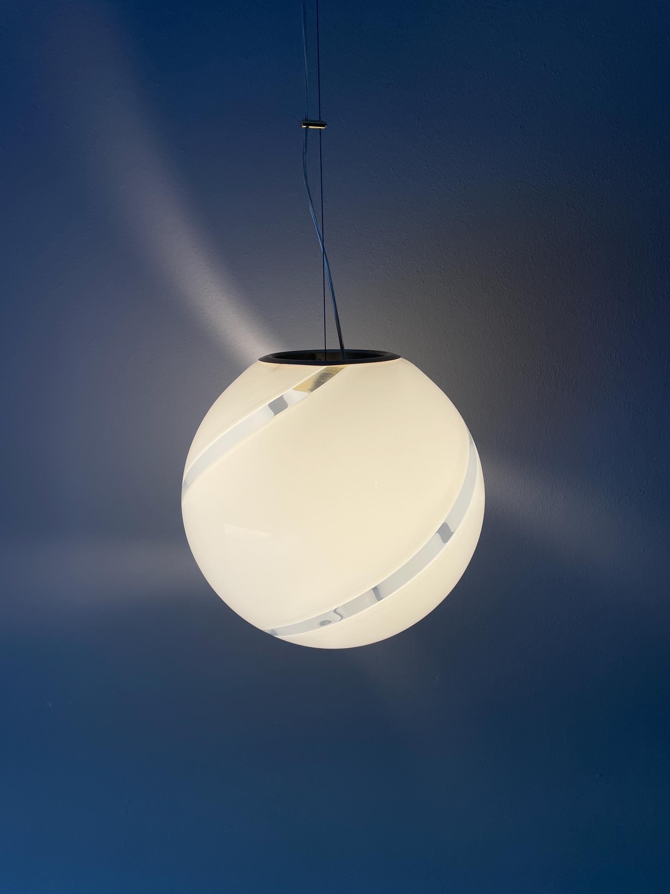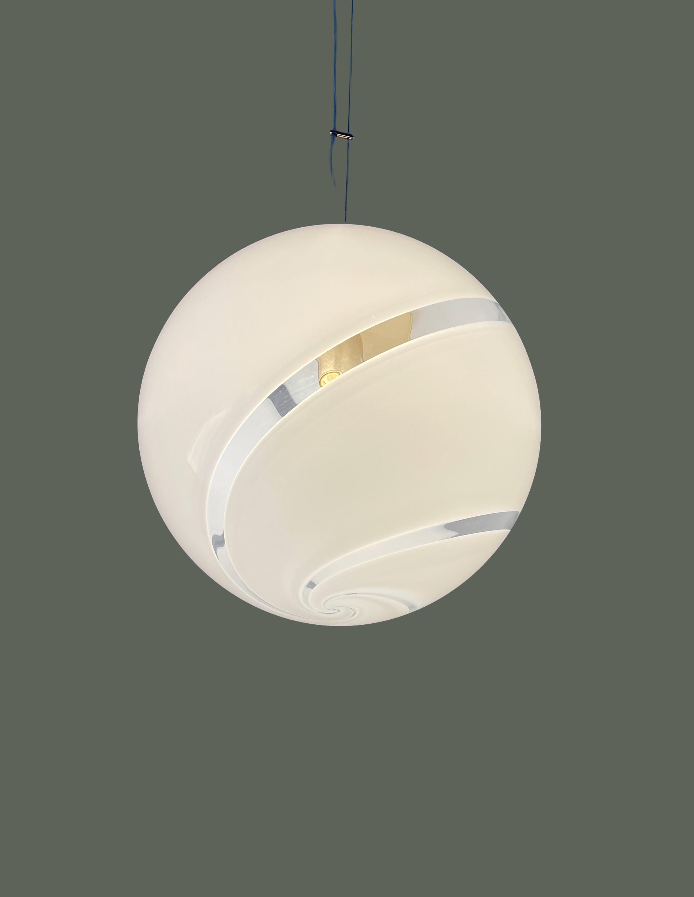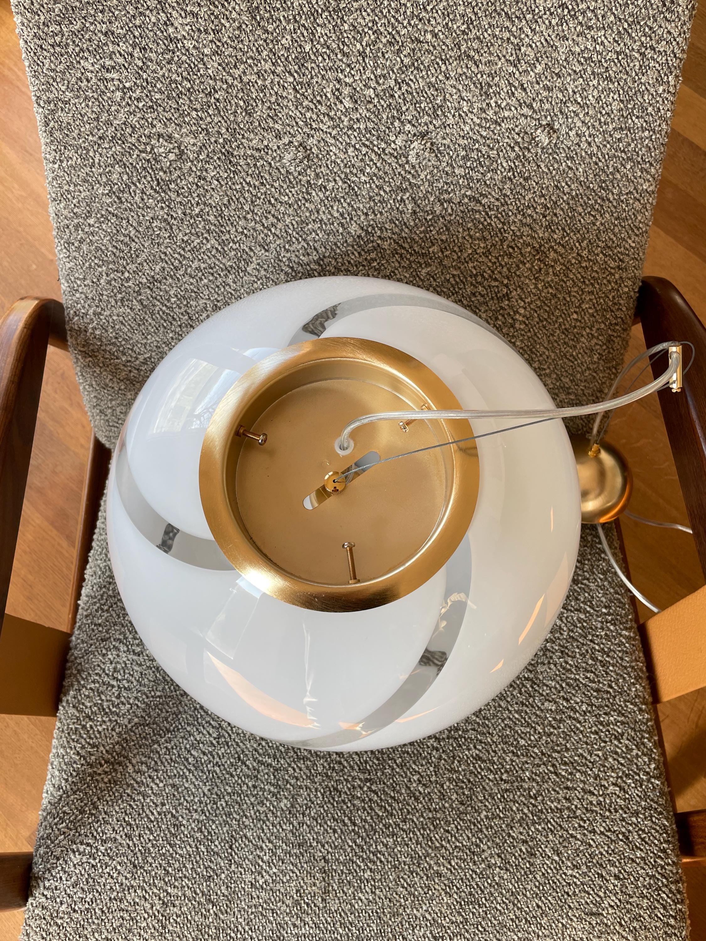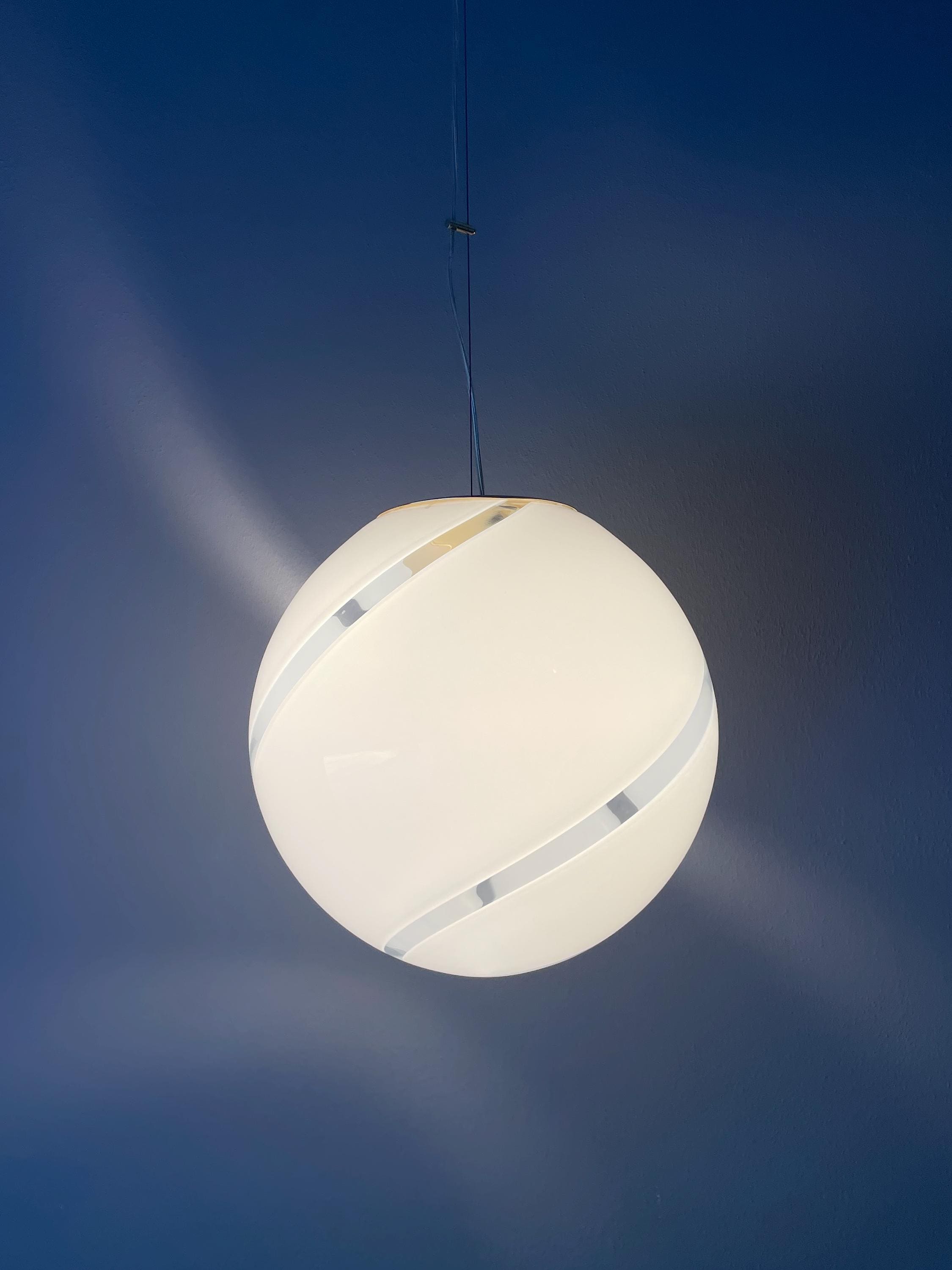 Splendidido lampadario in vetro di Murano, soffiato a bocca, nell'antica tecnica Muranese delle canne ritorte a spirale, bellissimo il vetro incamiciato, bianco e trasparente, la montatura ha finitura oro satinato, solo su richiesta, dopo aver fatto l'ordine, si può avere con montatura silver satinato.