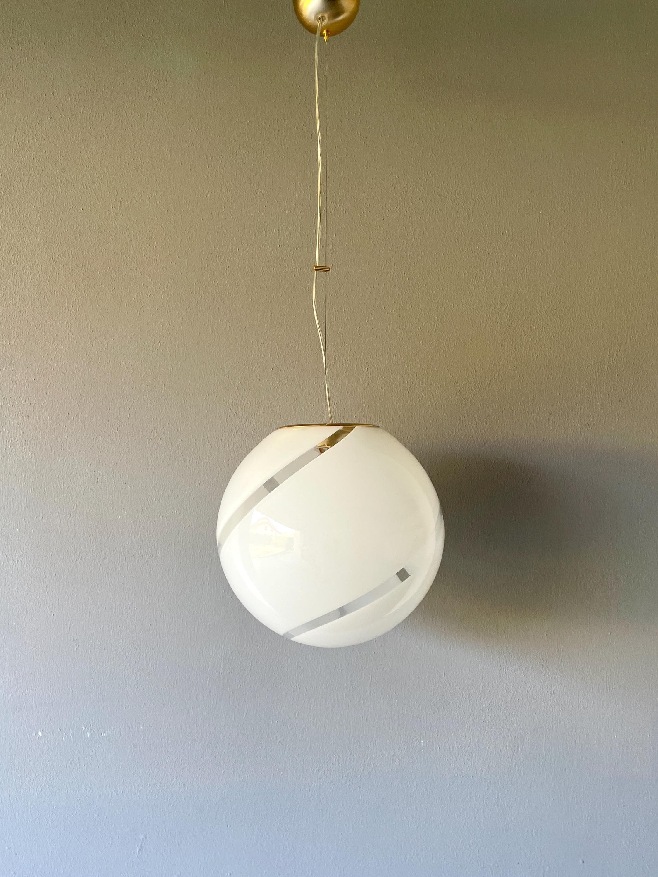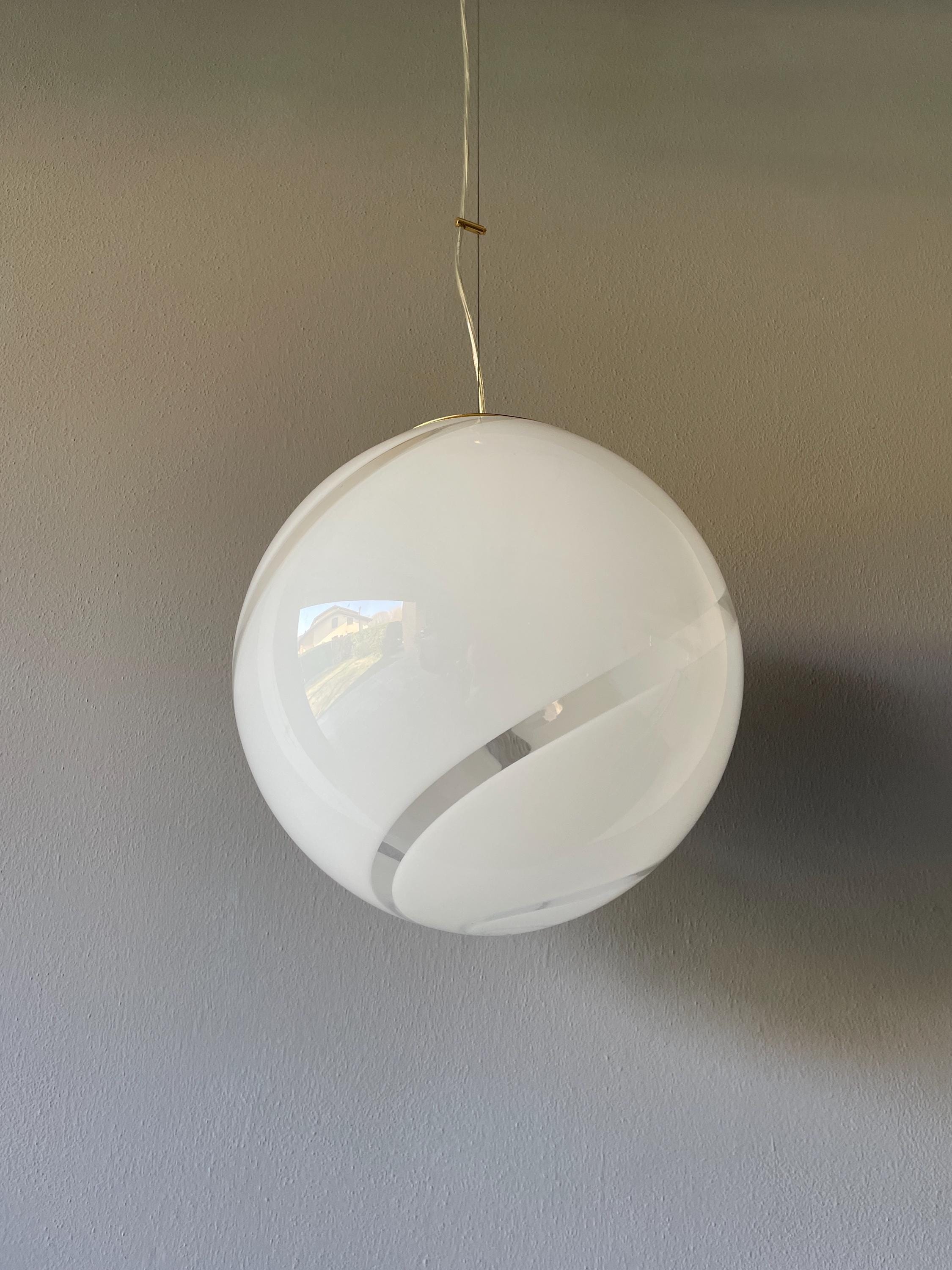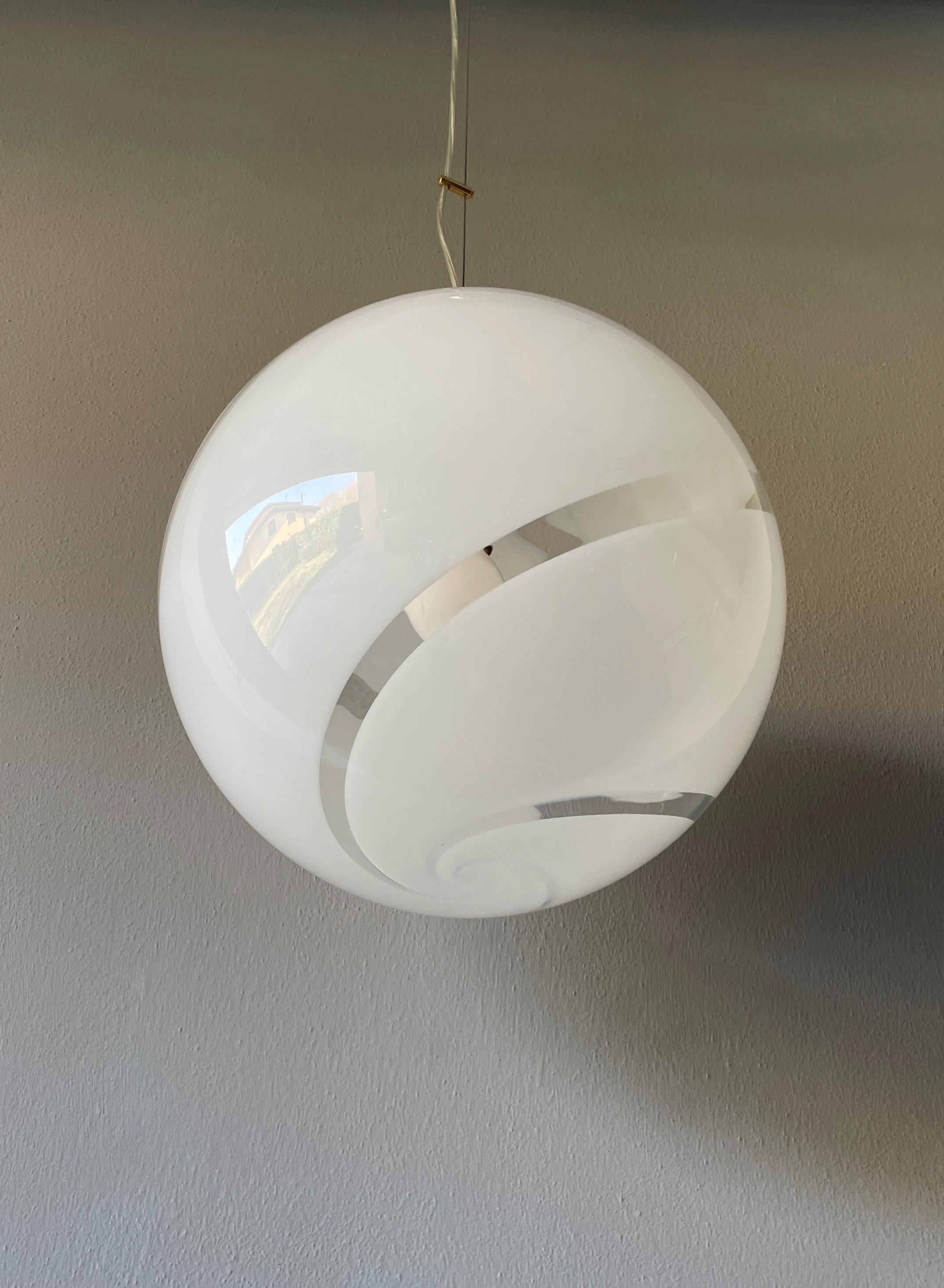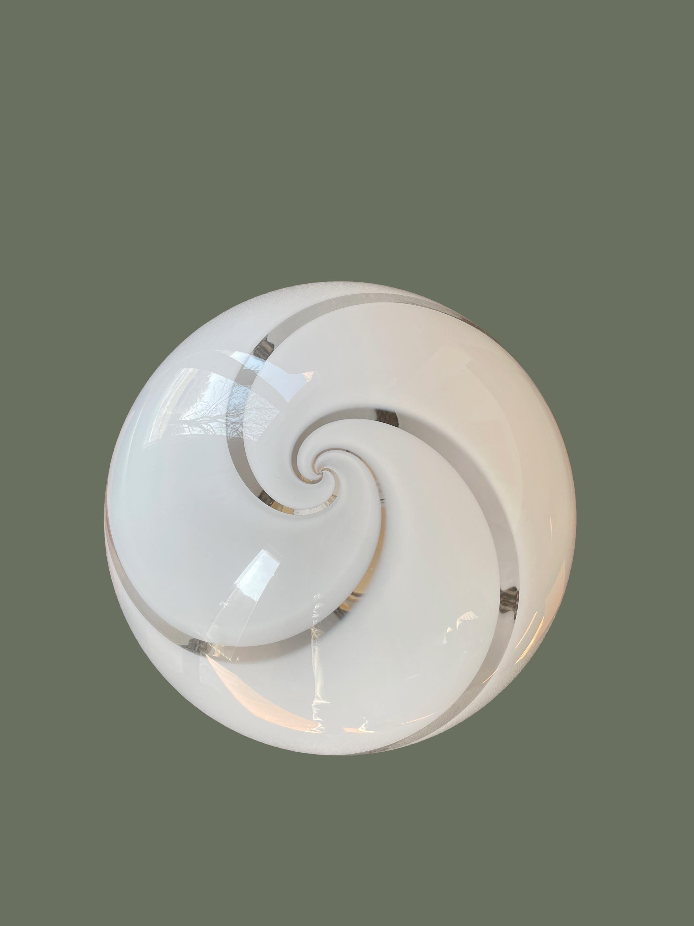 Splendidido lampadario in vetro di Murano, soffiato a bocca, nell'antica tecnica Muranese delle canne ritorte a spirale, bellissimo il vetro incamiciato, bianco e trasparente, la montatura ha finitura oro satinato, solo su richiesta, dopo aver fatto l'ordine, si può avere con montatura silver satinato.
