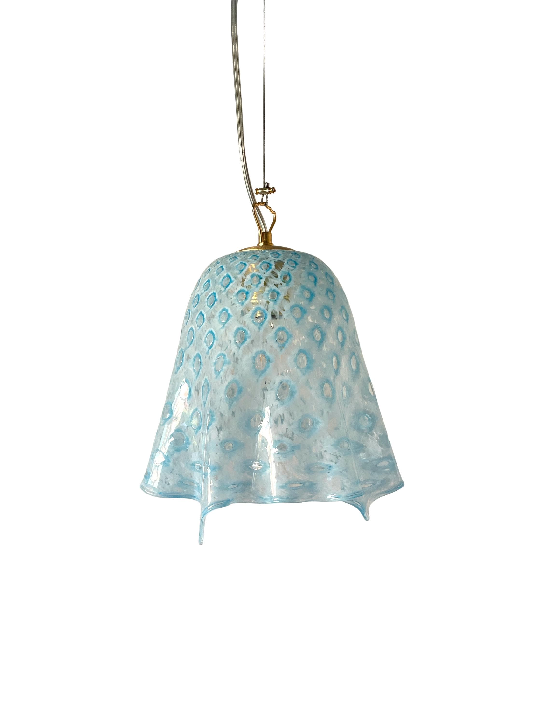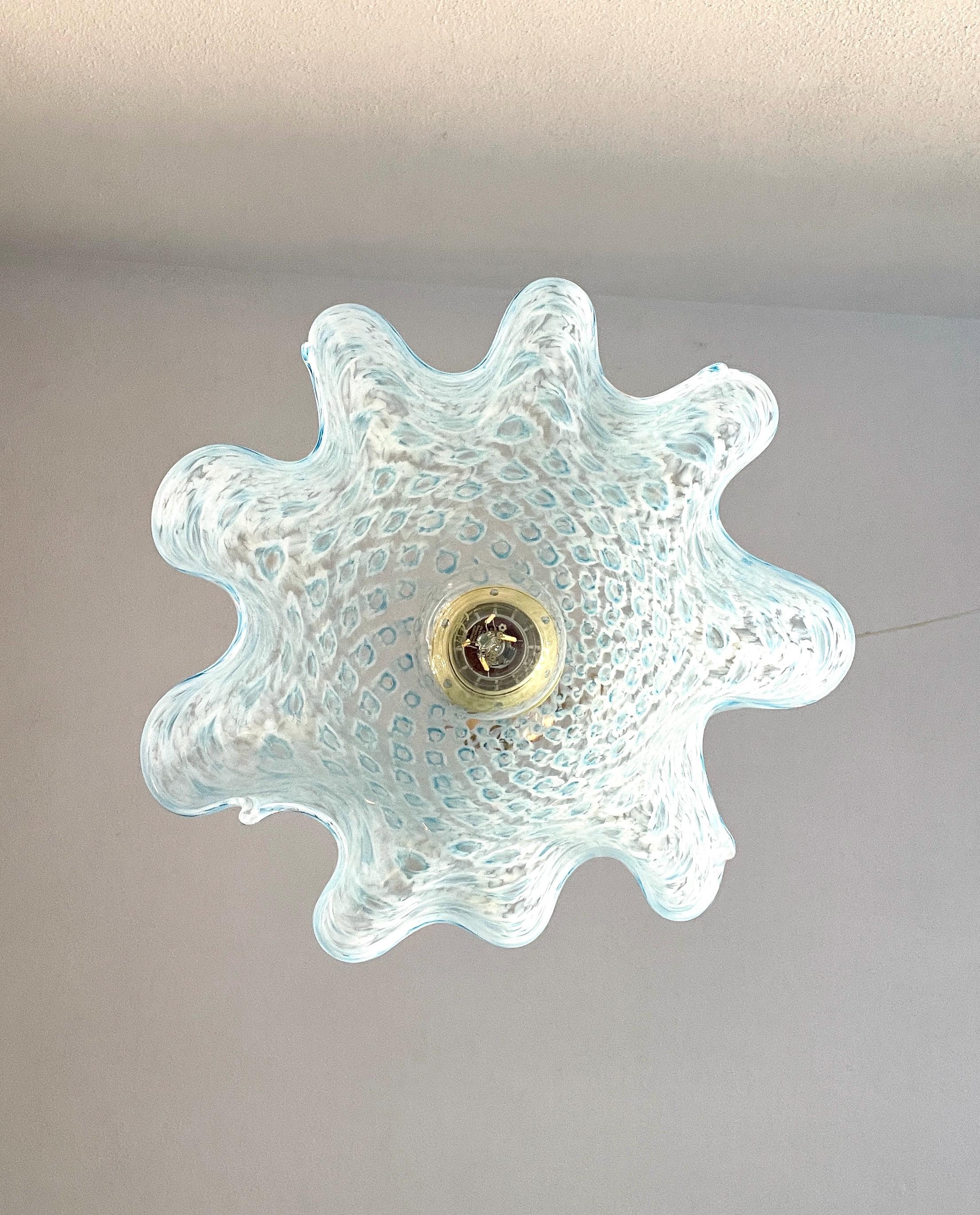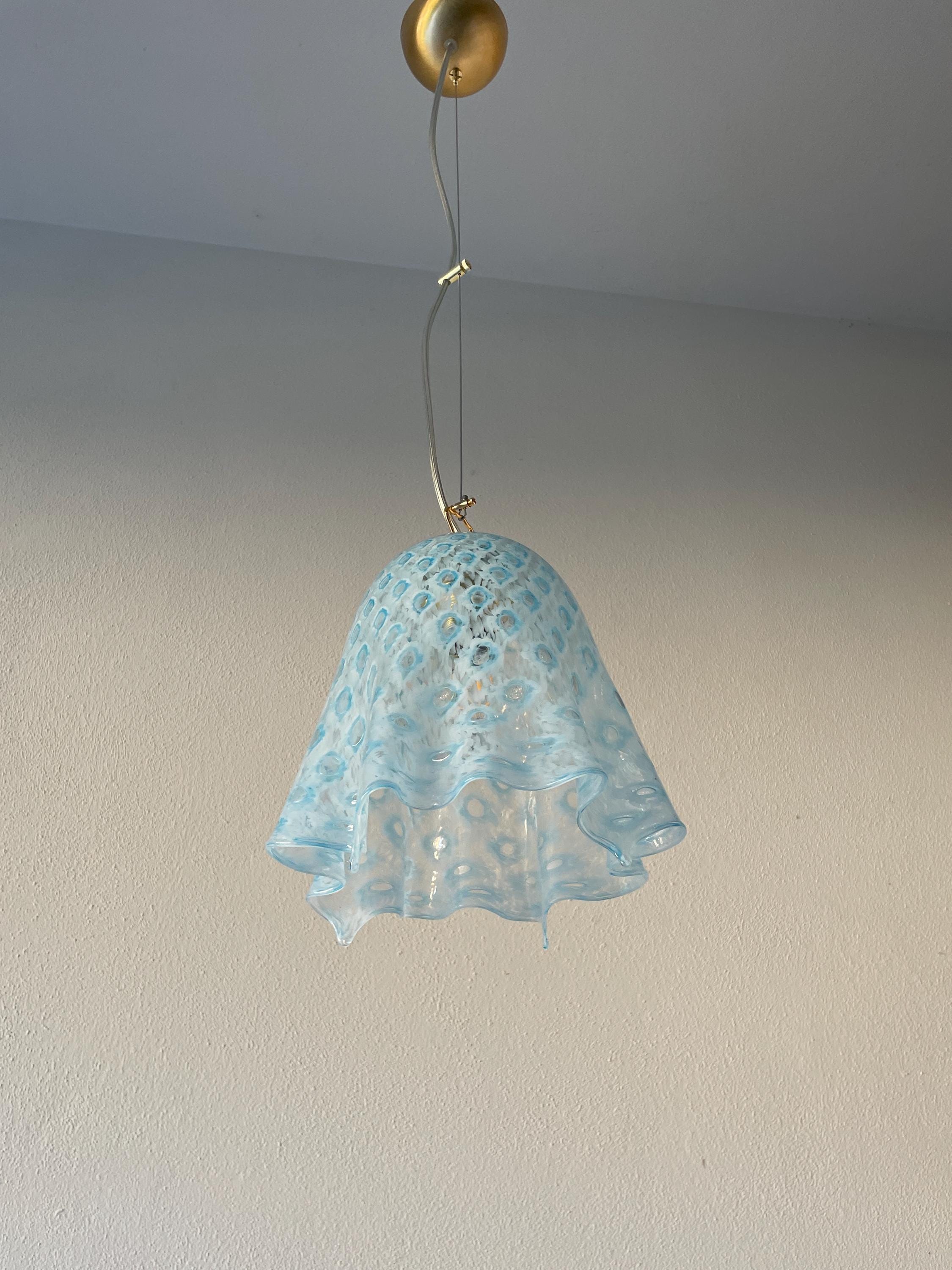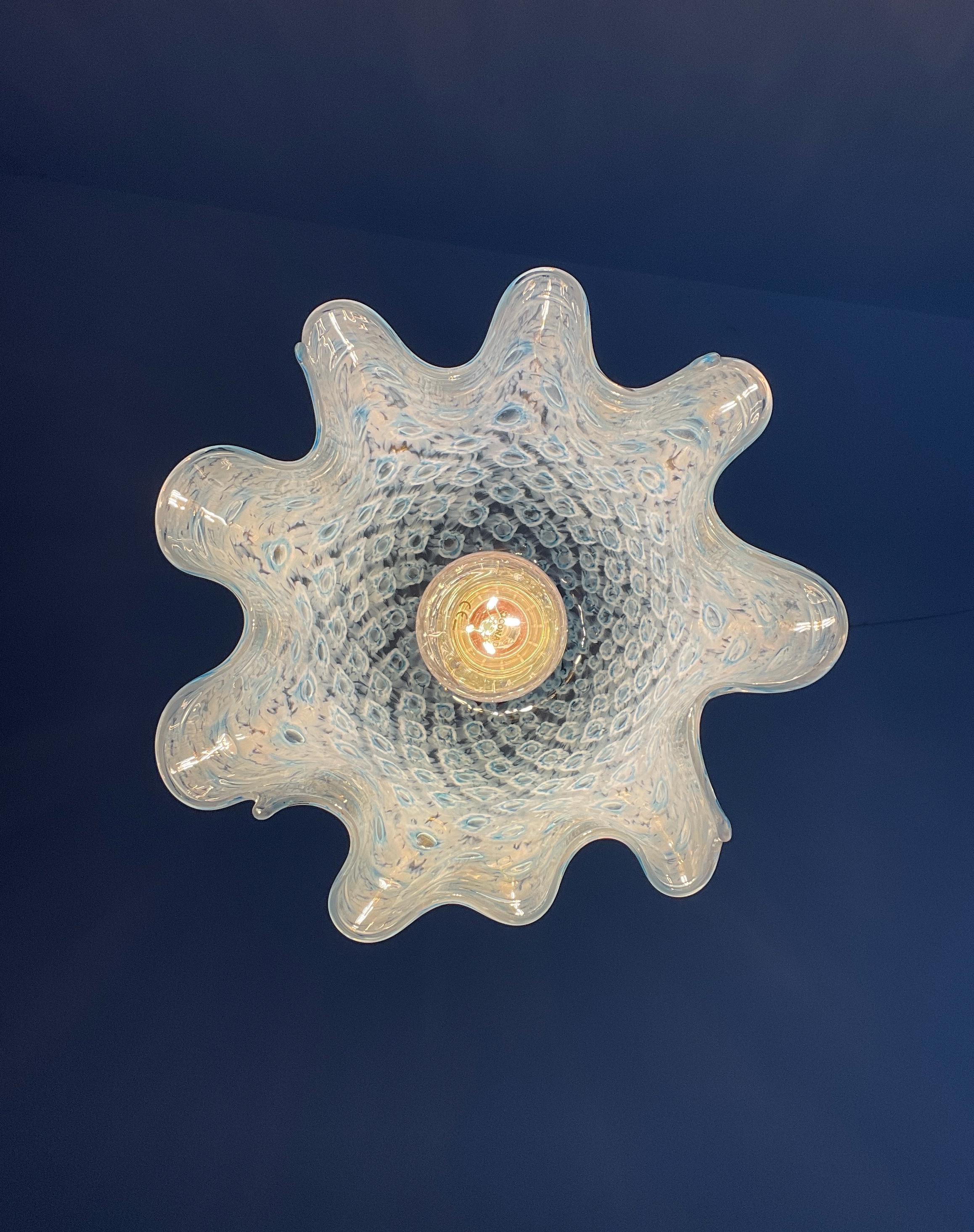 MACRAME' fazzoletto by LA MURRINA è uno splendido lampadario, vintage anni '90, con bellissimo vetro di Murano, soffiato a bocca e lavorato a mano dai maestri vetrai di La Murrina, nella tecnica del pavone pois, in colore azzurro.