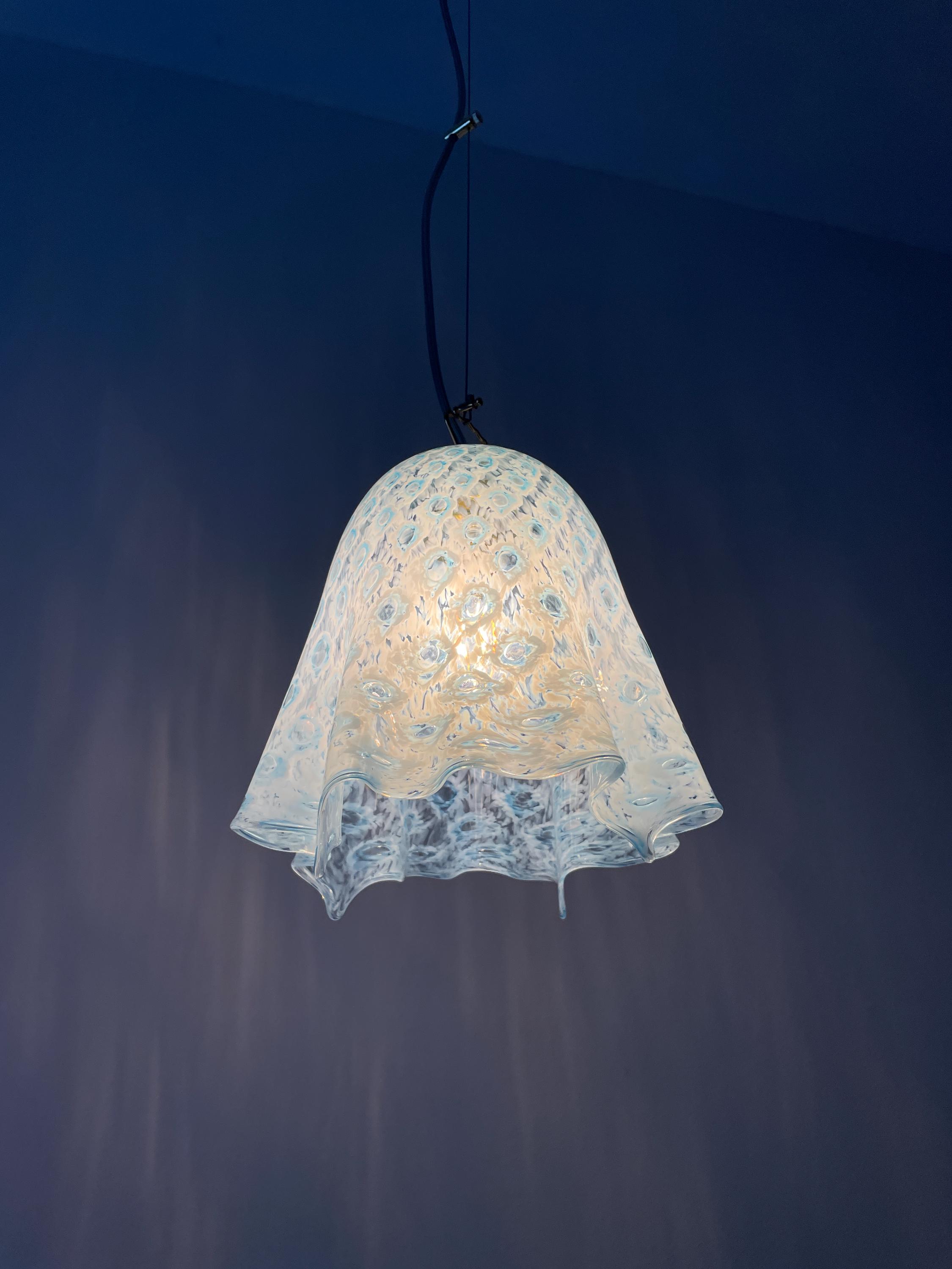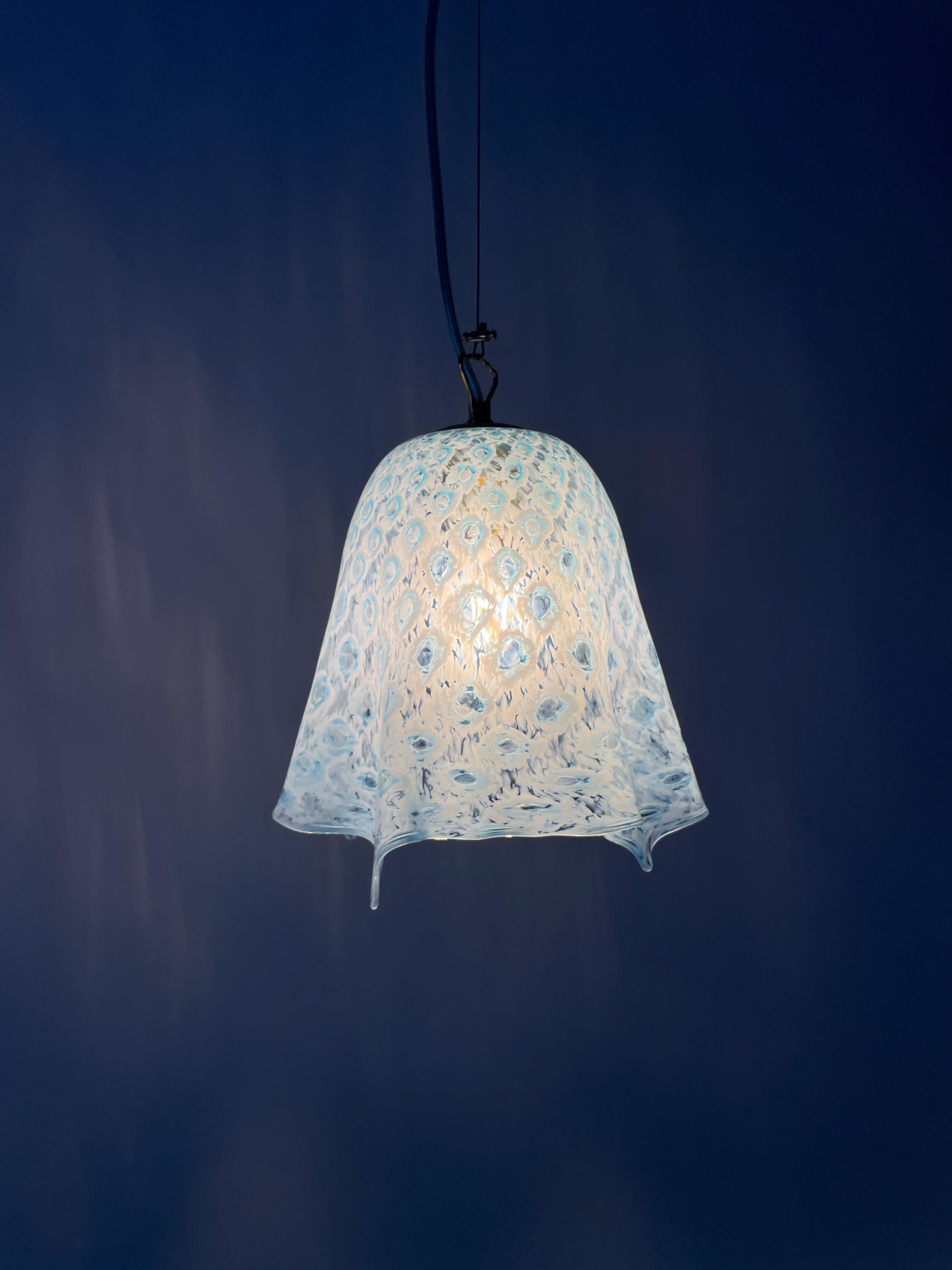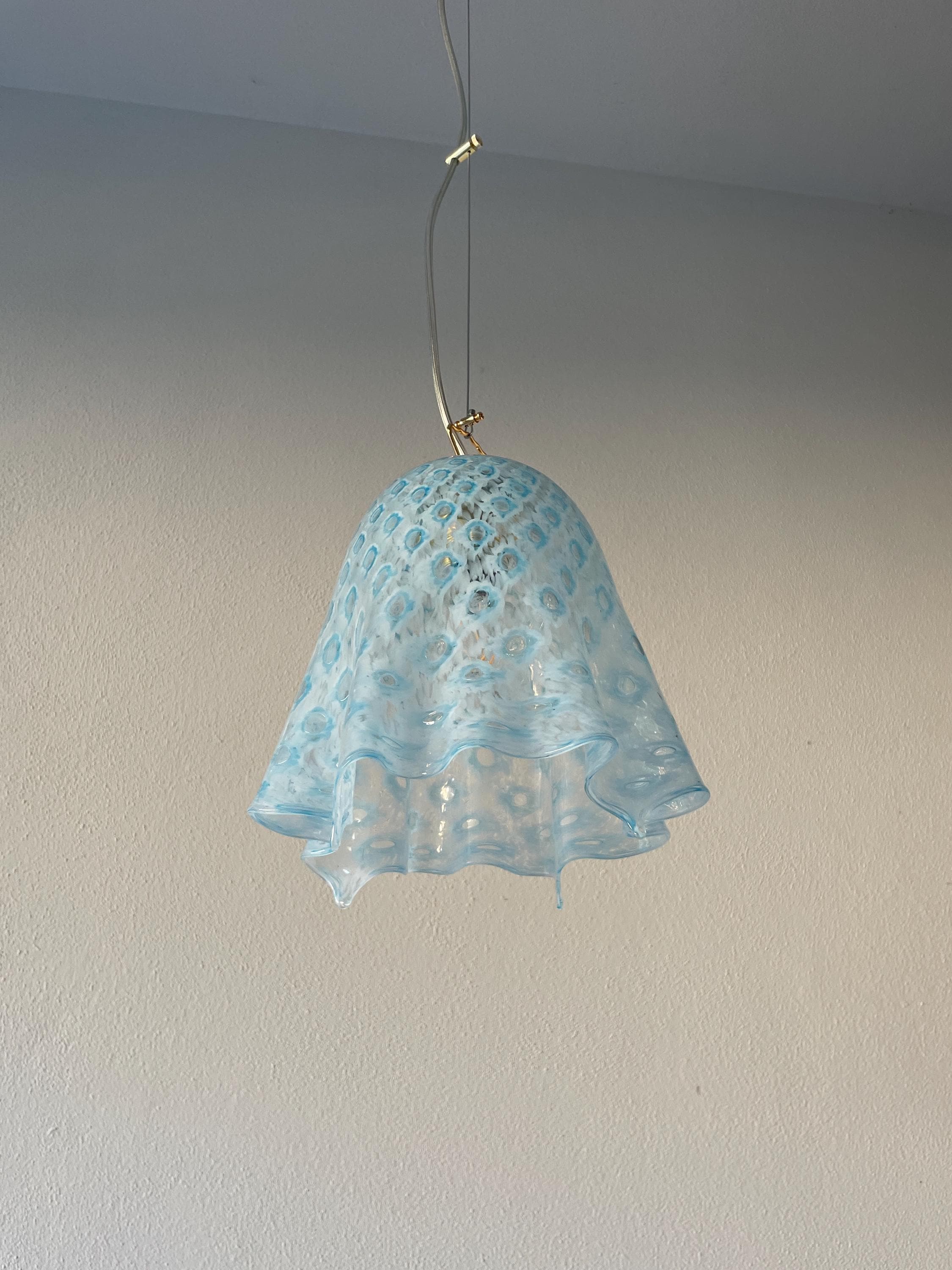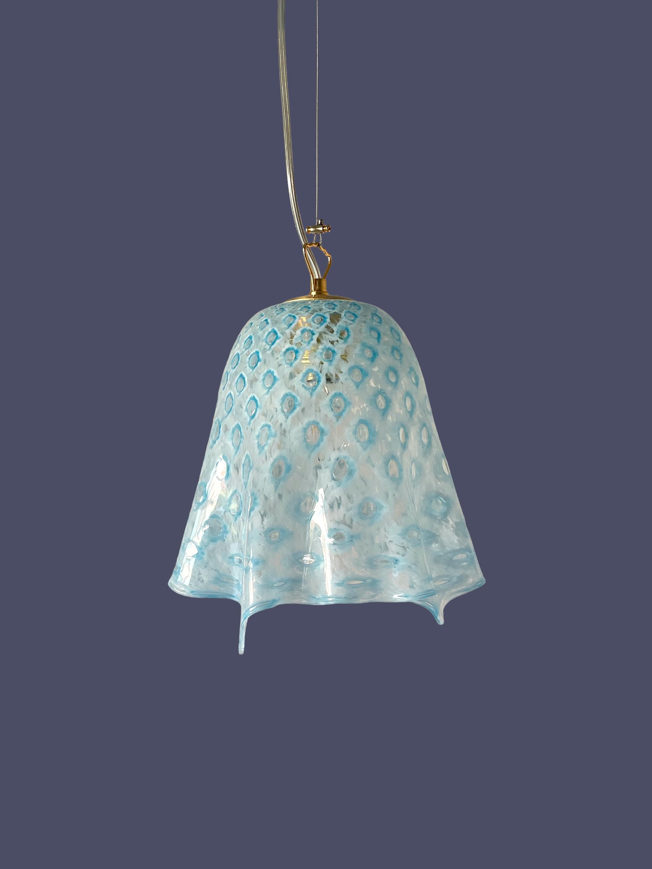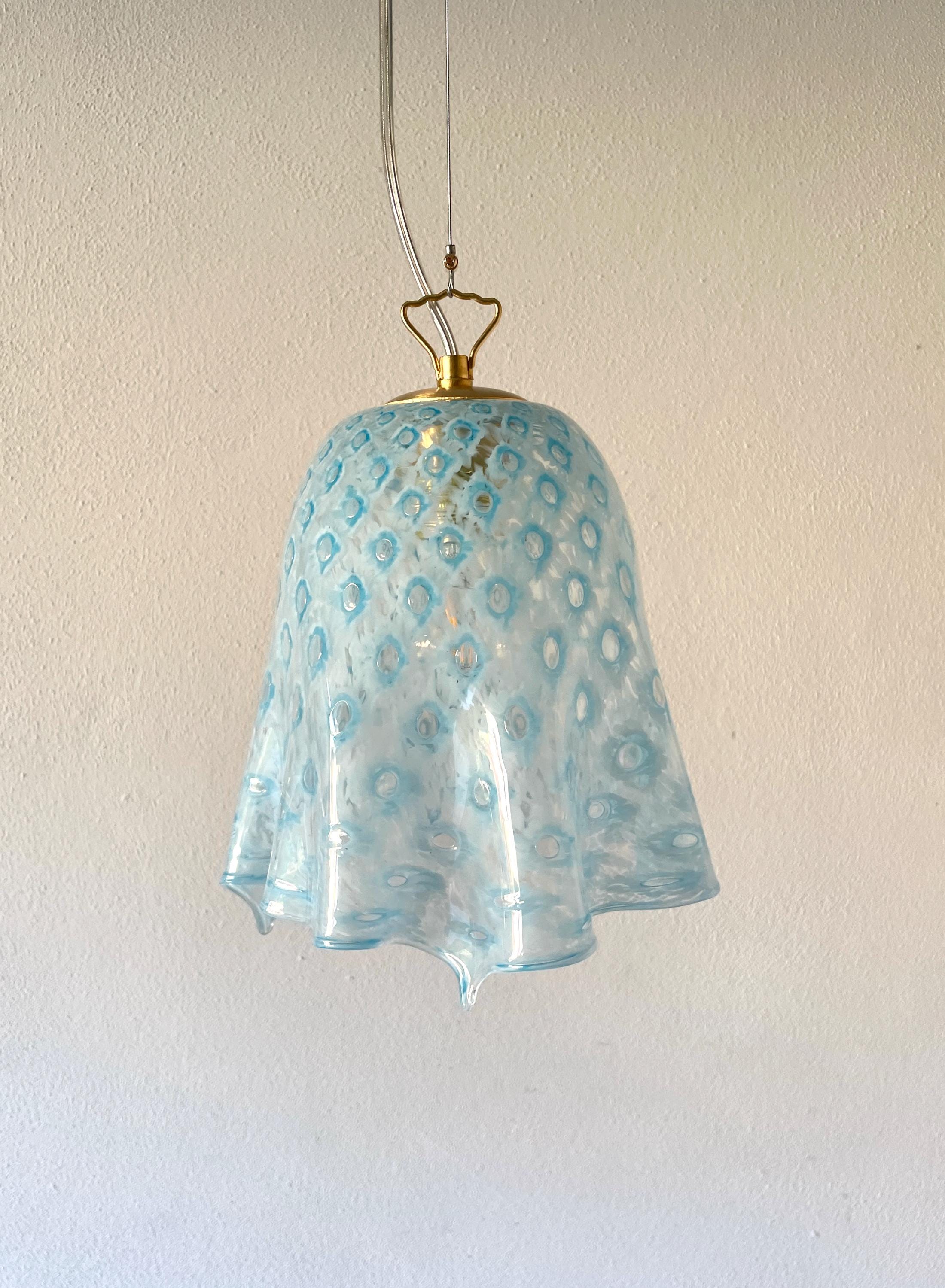MACRAME' fazzoletto by LA MURRINA è uno splendido lampadario, vintage anni '90, con bellissimo vetro di Murano, soffiato a bocca e lavorato a mano dai maestri vetrai di La Murrina, nella tecnica del pavone pois, in colore azzurro.