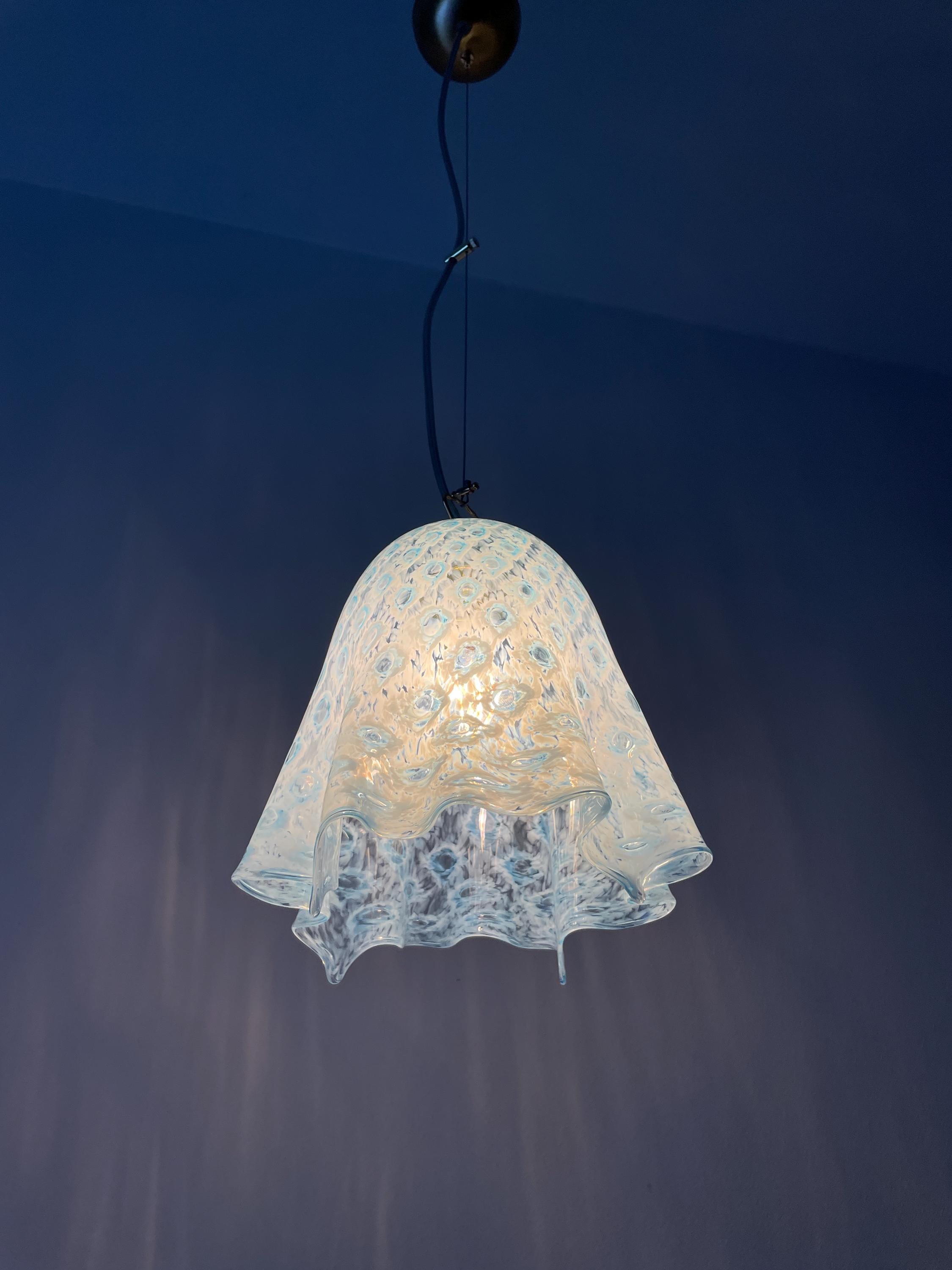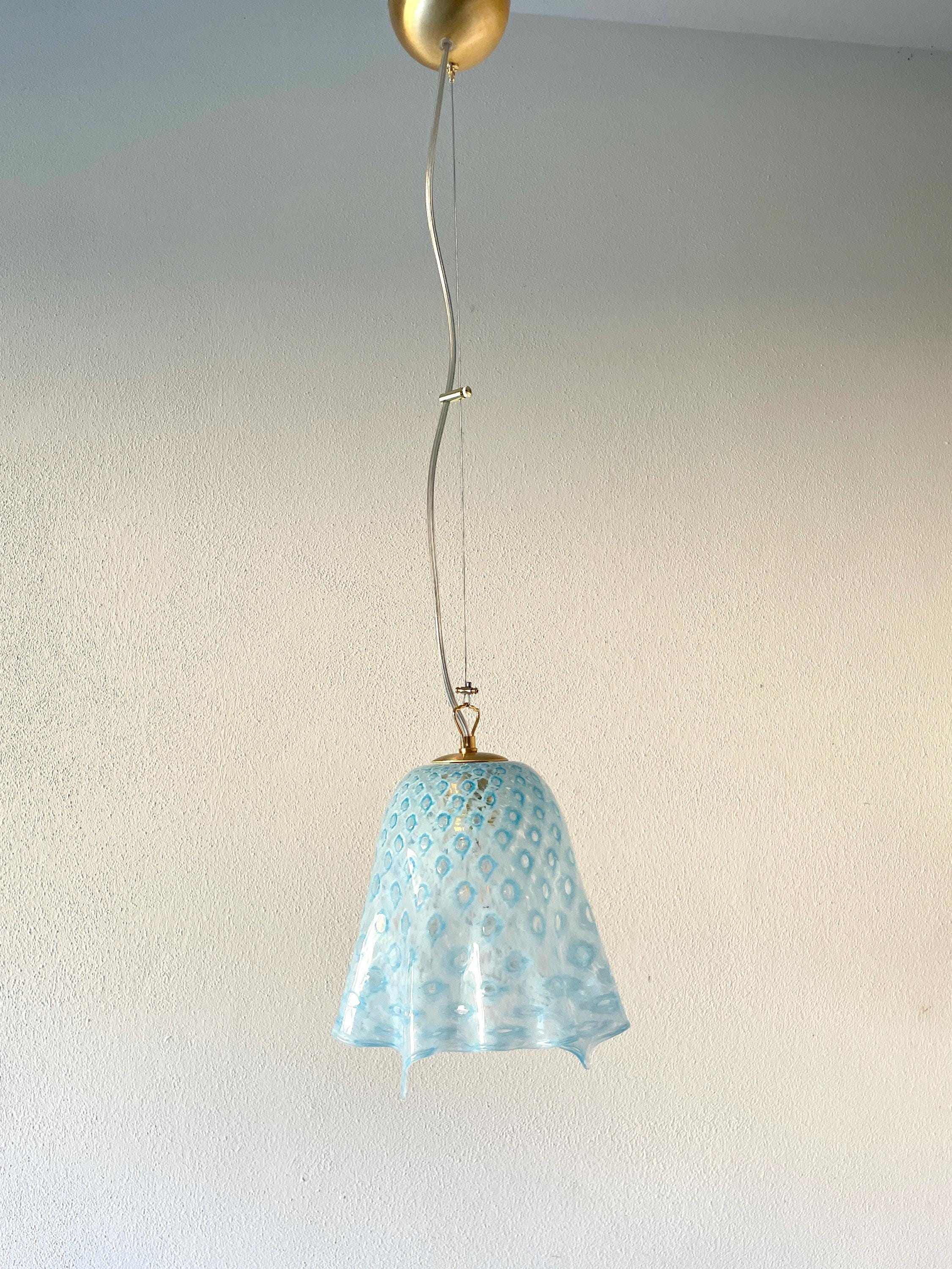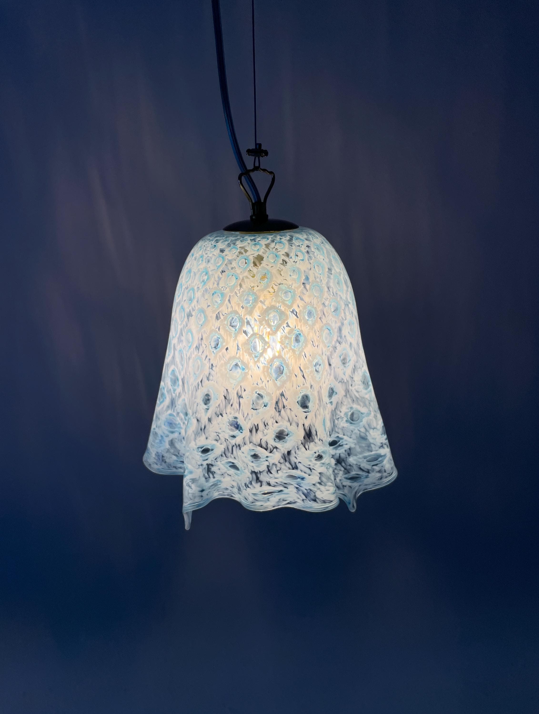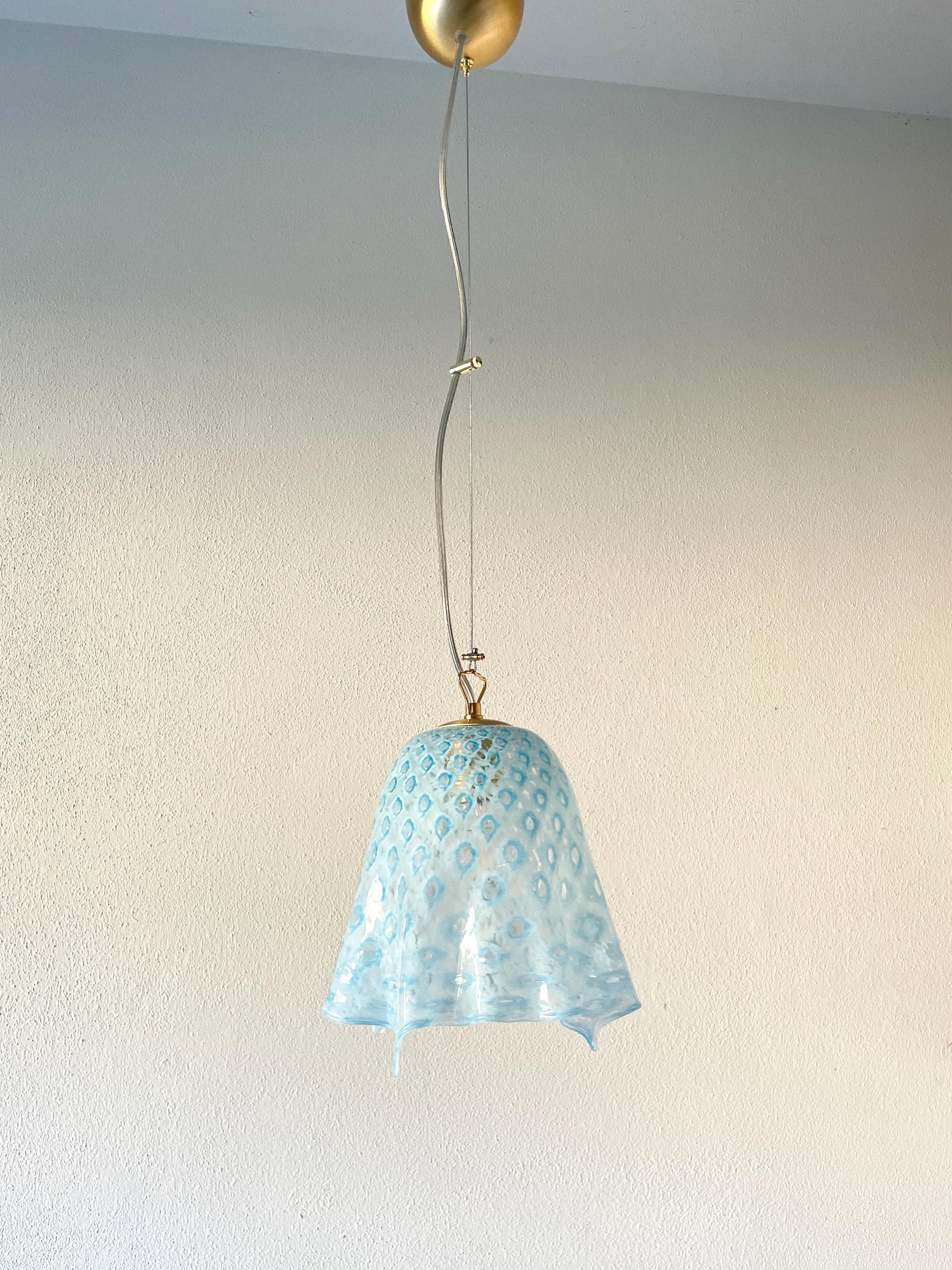 MACRAME' fazzoletto by LA MURRINA è uno splendido lampadario, vintage anni '90, con bellissimo vetro di Murano, soffiato a bocca e lavorato a mano dai maestri vetrai di La Murrina, nella tecnica del pavone pois, in colore azzurro.